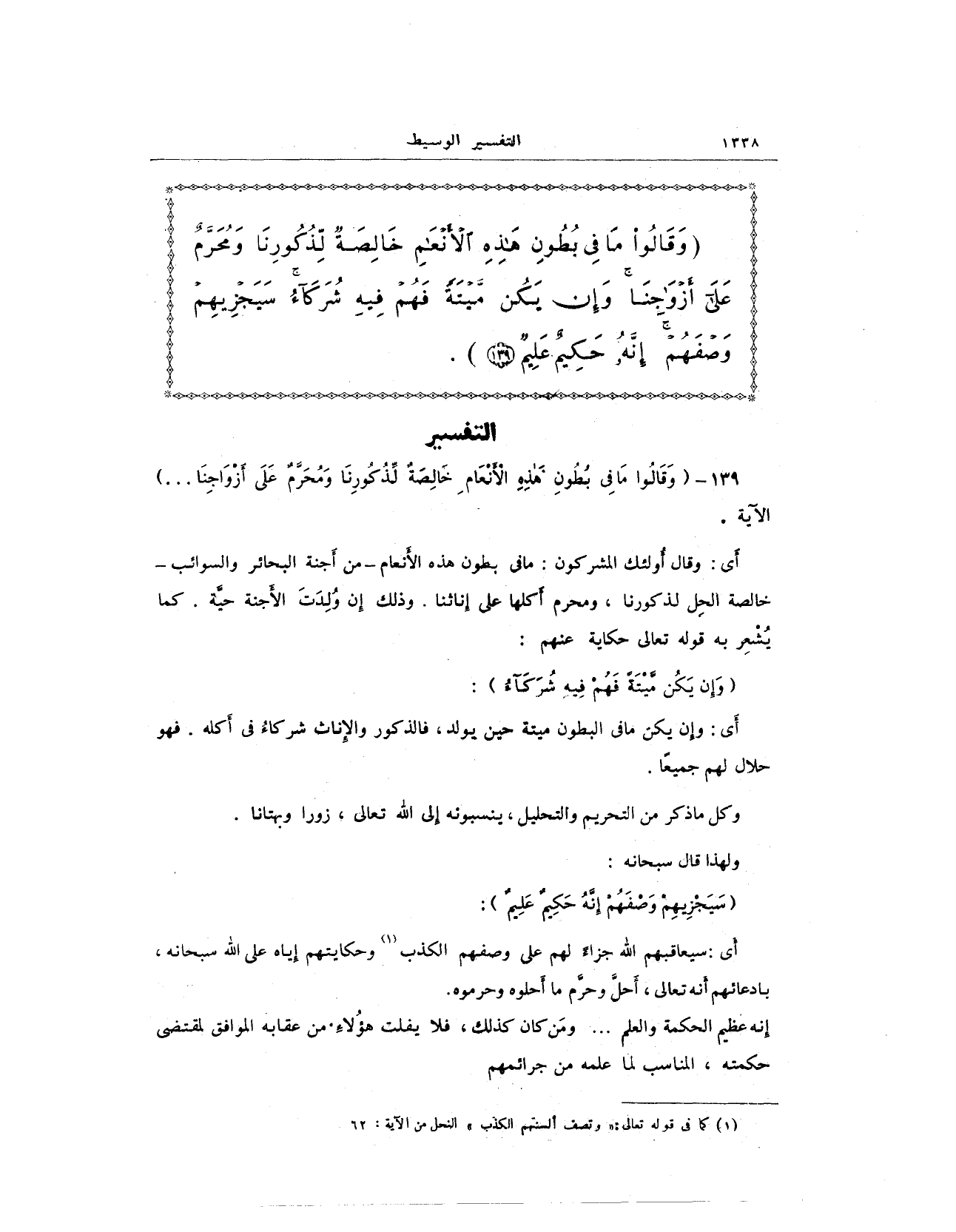 {وَقَالُوا مَا فِي بُطُونِ هَذِهِ الْأَنْعَامِ خَالِصَةٌ لِذُكُورِنَا وَمُحَرَّمٌ عَلَى أَزْوَاجِنَا وَإِنْ يَكُنْ مَيْتَةً فَهُمْ فِيهِ شُرَكَاءُ سَيَجْزِيهِمْ وَصْفَهُمْ إِنَّهُ حَكِيمٌ عَلِيمٌ (139)}.