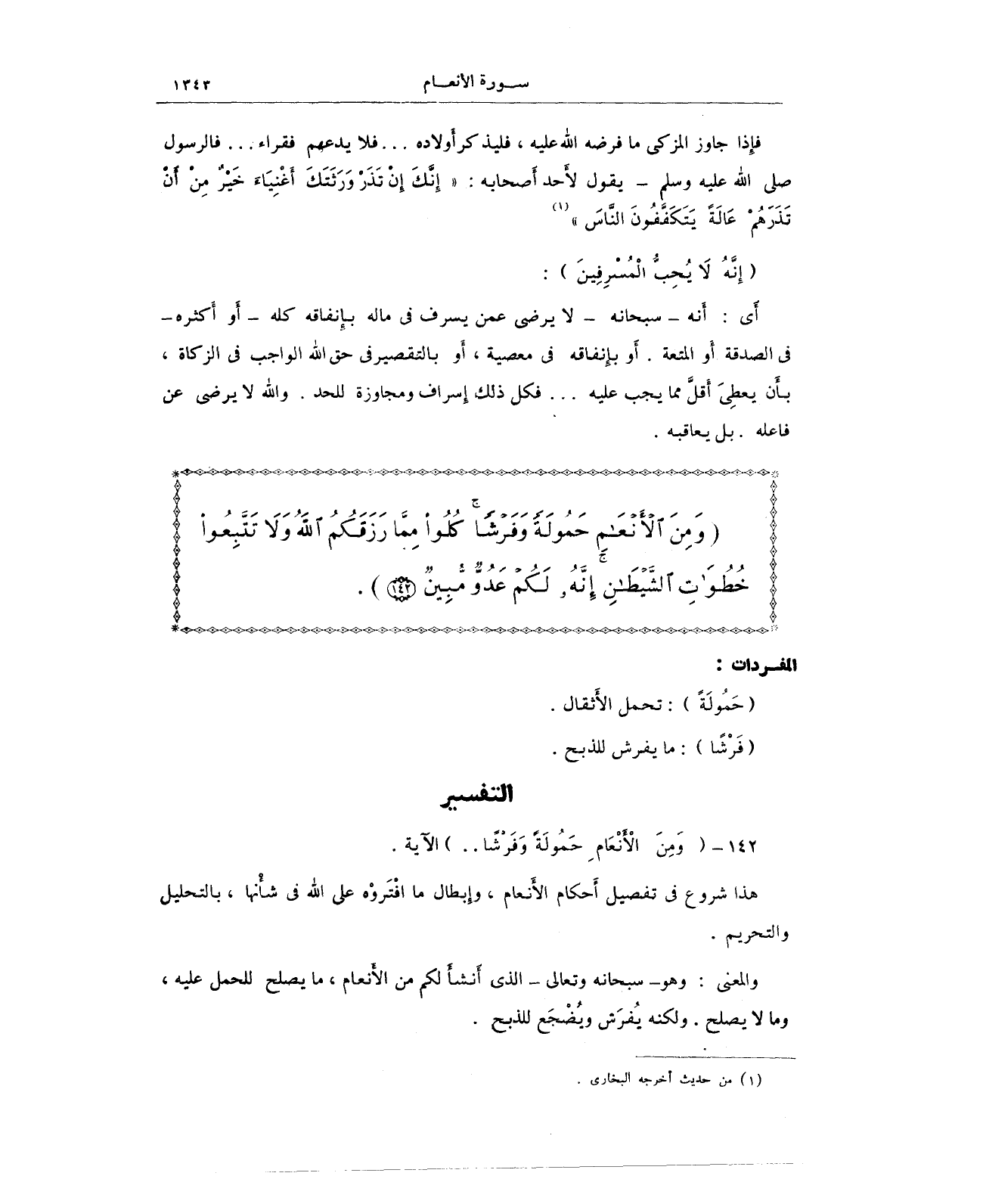 {وَمِنَ الْأَنْعَامِ حَمُولَةً وَفَرْشًا كُلُوا مِمَّا رَزَقَكُمُ اللَّهُ وَلَا تَتَّبِعُوا خُطُوَاتِ الشَّيْطَانِ إِنَّهُ لَكُمْ عَدُوٌّ مُبِينٌ (142)}.