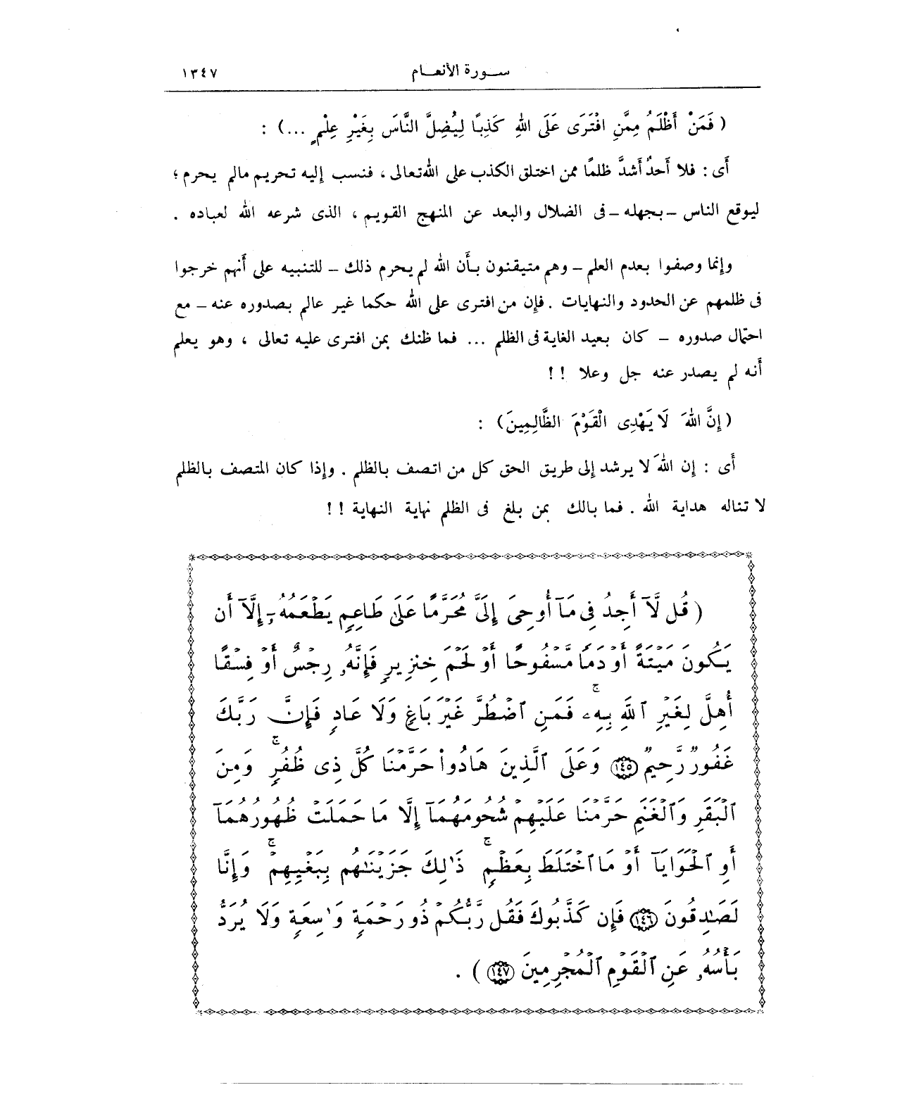 {قُلْ لَا أَجِدُ فِي مَا أُوحِيَ إِلَيَّ مُحَرَّمًا عَلَى طَاعِمٍ يَطْعَمُهُ إِلَّا أَنْ يَكُونَ مَيْتَةً أَوْ دَمًا مَسْفُوحًا أَوْ لَحْمَ خِنْزِيرٍ فَإِنَّهُ رِجْسٌ أَوْ فِسْقًا أُهِلَّ لِغَيْرِ اللَّهِ بِهِ فَمَنِ اضْطُرَّ غَيْرَ بَاغٍ وَلَا عَادٍ فَإِنَّ رَبَّكَ غَفُورٌ رَحِيمٌ (145) وَعَلَى الَّذِينَ هَادُوا حَرَّمْنَا كُلَّ ذِي ظُفُرٍ وَمِنَ الْبَقَرِ وَالْغَنَمِ حَرَّمْنَا عَلَيْهِمْ شُحُومَهُمَا إِلَّا مَا حَمَلَتْ ظُهُورُهُمَا أَوِ الْحَوَايَا أَوْ مَا اخْتَلَطَ بِعَظْمٍ ذَلِكَ جَزَيْنَاهُمْ بِبَغْيِهِمْ وَإِنَّا لَصَادِقُونَ (146) فَإِنْ كَذَّبُوكَ فَقُلْ رَبُّكُمْ ذُورَحْمَةٍ وَاسِعَةٍ وَلَا يُرَدُّ بَأْسُهُ عَنِ الْقَوْمِ الْمُجْرِمِينَ (147)}.