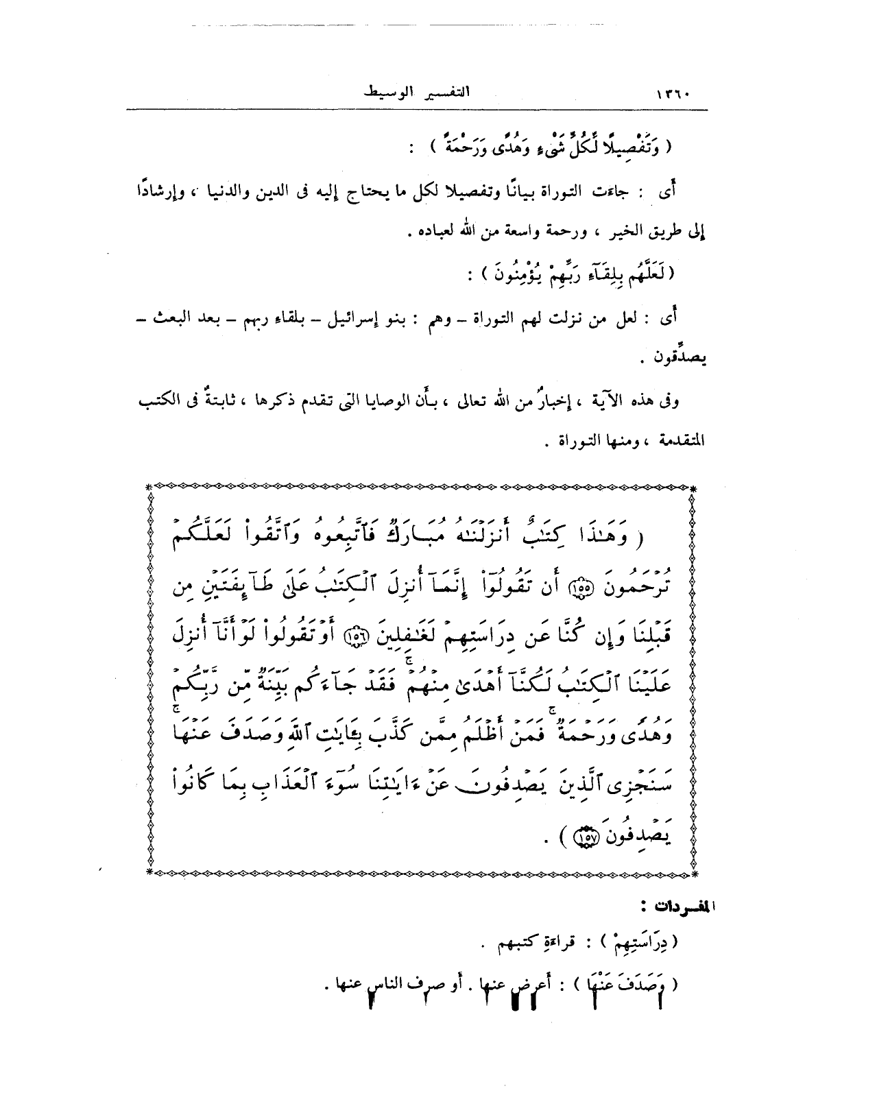 {وَهَذَا كِتَابٌ أَنْزَلْنَاهُ مُبَارَكٌ فَاتَّبِعُوهُ وَاتَّقُوا لَعَلَّكُمْ تُرْحَمُونَ (155) أَنْ تَقُولُوا إِنَّمَا أُنْزِلَ الْكِتَابُ عَلَى طَائِفَتَيْنِ مِنْ قَبْلِنَا وَإِنْ كُنَّا عَنْ دِرَاسَتِهِمْ لَغَافِلِينَ (156) أَوْ تَقُولُوا لَوْ أَنَّا أُنْزِلَ عَلَيْنَا الْكِتَابُ لَكُنَّا أَهْدَى مِنْهُمْ فَقَدْ جَاءَكُمْ بَيِّنَةٌ مِنْ رَبِّكُمْ وَهُدًى وَرَحْمَةٌ فَمَنْ أَظْلَمُ مِمَّنْ كَذَّبَ بِآيَاتِ اللَّهِ وَصَدَفَ عَنْهَا سَنَجْزِي الَّذِينَ يَصْدِفُونَ عَنْ آيَاتِنَا سُوءَ الْعَذَابِ بِمَا كَانُوا يَصْدِفُونَ (157)}.