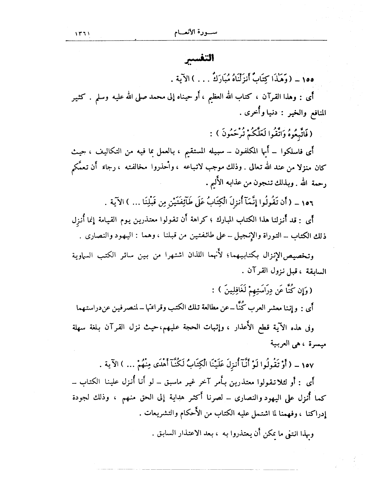 155 - {وَهَذَا كِتَابٌ أَنْزَلْنَاهُ مُبَارَكٌ ... } الآية.