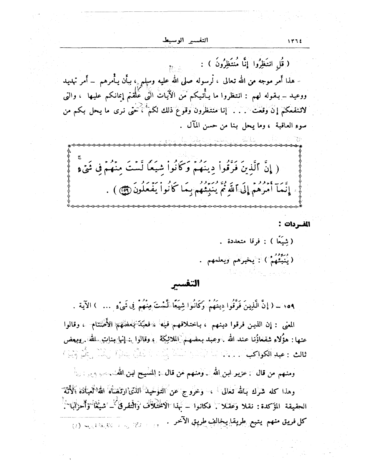 {إِنَّ الَّذِينَ فَرَّقُوا دِينَهُمْ وَكَانُوا شِيَعًا لَسْتَ مِنْهُمْ فِي شَيْءٍ إِنَّمَا أَمْرُهُمْ إِلَى اللَّهِ ثُمَّ يُنَبِّئُهُمْ بِمَا كَانُوا يَفْعَلُونَ (159)}.