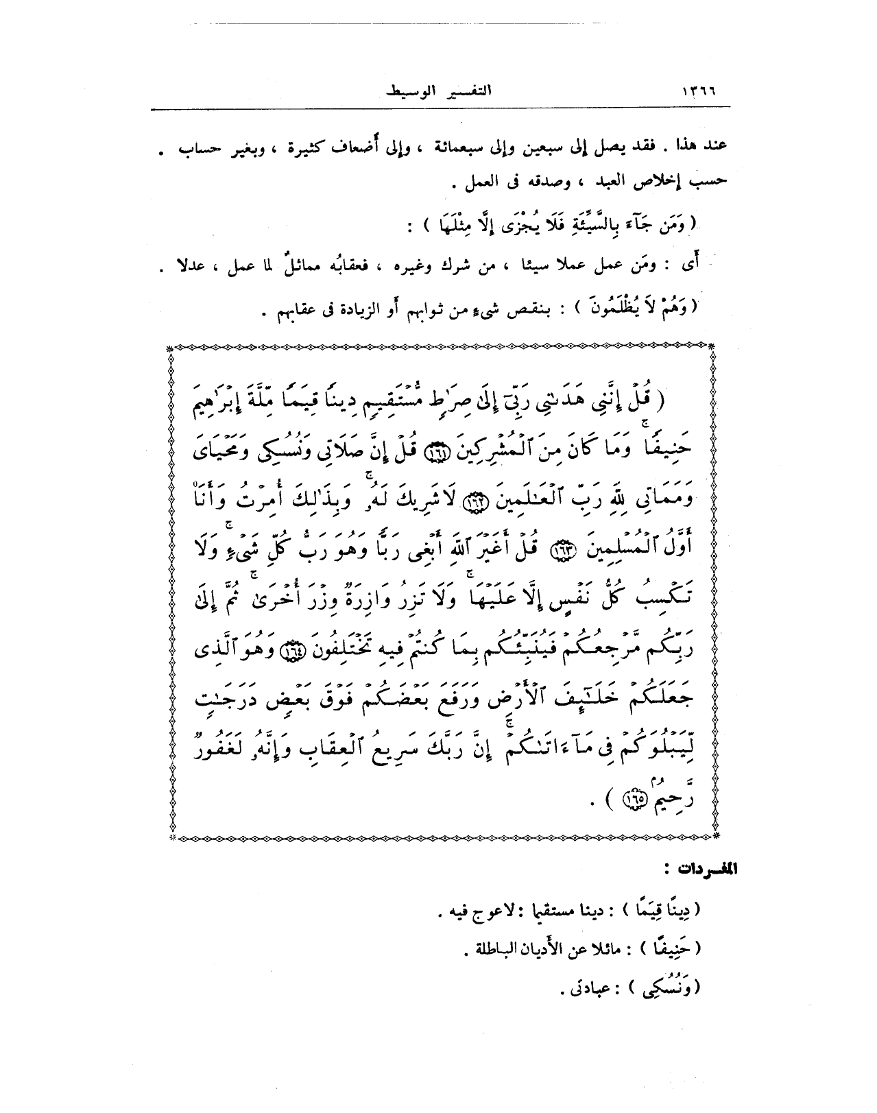 {قُلْ إِنَّنِي هَدَانِي رَبِّي إِلَى صِرَاطٍ مُسْتَقِيمٍ دِينًا قِيَمًا مِلَّةَ إِبْرَاهِيمَ حَنِيفًا وَمَا كَانَ مِنَ الْمُشْرِكِينَ (161) قُلْ إِنَّ صَلَاتِي وَنُسُكِي وَمَحْيَايَ وَمَمَاتِي لِلَّهِ رَبِّ الْعَالَمِينَ (162) لَا شَرِيكَ لَهُ وَبِذَلِكَ أُمِرْتُ وَأَنَا أَوَّلُ الْمُسْلِمِينَ (163) قُلْ أَغَيْرَ اللَّهِ أَبْغِي رَبًّا وَهُوَ رَبُّ كُلِّ شَيْءٍ وَلَا تَكْسِبُ كُلُّ نَفْسٍ إِلَّا عَلَيْهَا وَلَا تَزِرُ وَازِرَةٌ وِزْرَ أُخْرَى ثُمَّ إِلَى رَبِّكُمْ مَرْجِعُكُمْ فَيُنَبِّئُكُمْ بِمَا كُنْتُمْ فِيهِ تَخْتَلِفُونَ (164) وَهُوَ الَّذِي جَعَلَكُمْ خَلَائِفَ الْأَرْضِ وَرَفَعَ بَعْضَكُمْ فَوْقَ بَعْضٍ دَرَجَاتٍ لِيَبْلُوَكُمْ فِي مَا آتَاكُمْ إِنَّ رَبَّكَ سَرِيعُ الْعِقَابِ وَإِنَّهُ لَغَفُورٌ رَحِيمٌ (165)}.