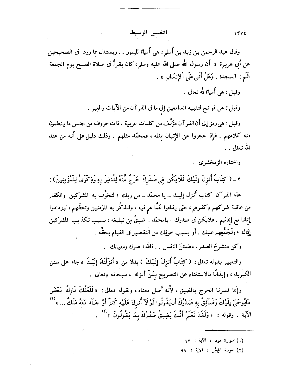 وإِنما فسرنا الحرج بالضيق، لأَنه أَصل معناه، ولقوله تعالى: {فَلَعَلَّكَ تَارِكٌ بَعْضَ مَا يُوحَى إِلَيْكَ وَضَائِقٌ بِهِ صَدْرُكَ أَنْ يَقُولُوا لَوْلَا أُنْزِلَ عَلَيْهِ كَنْزٌ أَوْ جَاءَ مَعَهُ مَلَكٌ ... } (¬1) الآية. وقوله: {وَلَقَدْ نَعْلَمُ أَنَّكَ يَضِيقُ صَدْرُكَ بِمَا يَقُولُونَ} (¬2).