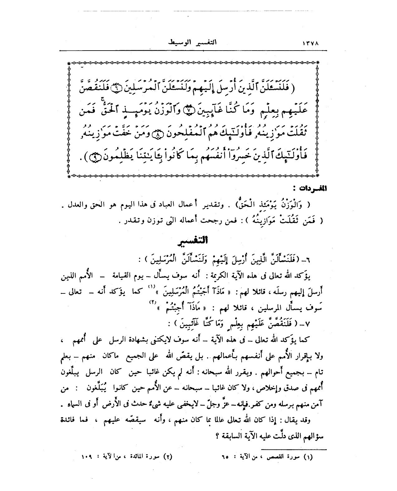 {فَلَنَسْأَلَنَّ الَّذِينَ أُرْسِلَ إِلَيْهِمْ وَلَنَسْأَلَنَّ الْمُرْسَلِينَ (6) فَلَنَقُصَّنَّ عَلَيْهِمْ بِعِلْمٍ وَمَا كُنَّا غَائِبِينَ (7) وَالْوَزْنُ يَوْمَئِذٍ الْحَقُّ فَمَنْ ثَقُلَتْ مَوَازِينُهُ فَأُولَئِكَ هُمُ الْمُفْلِحُونَ (8) وَمَنْ خَفَّتْ مَوَازِينُهُ فَأُولَئِكَ الَّذِينَ خَسِرُوا أَنْفُسَهُمْ بِمَا كَانُوا بِآيَاتِنَا يَظْلِمُونَ (9)}.