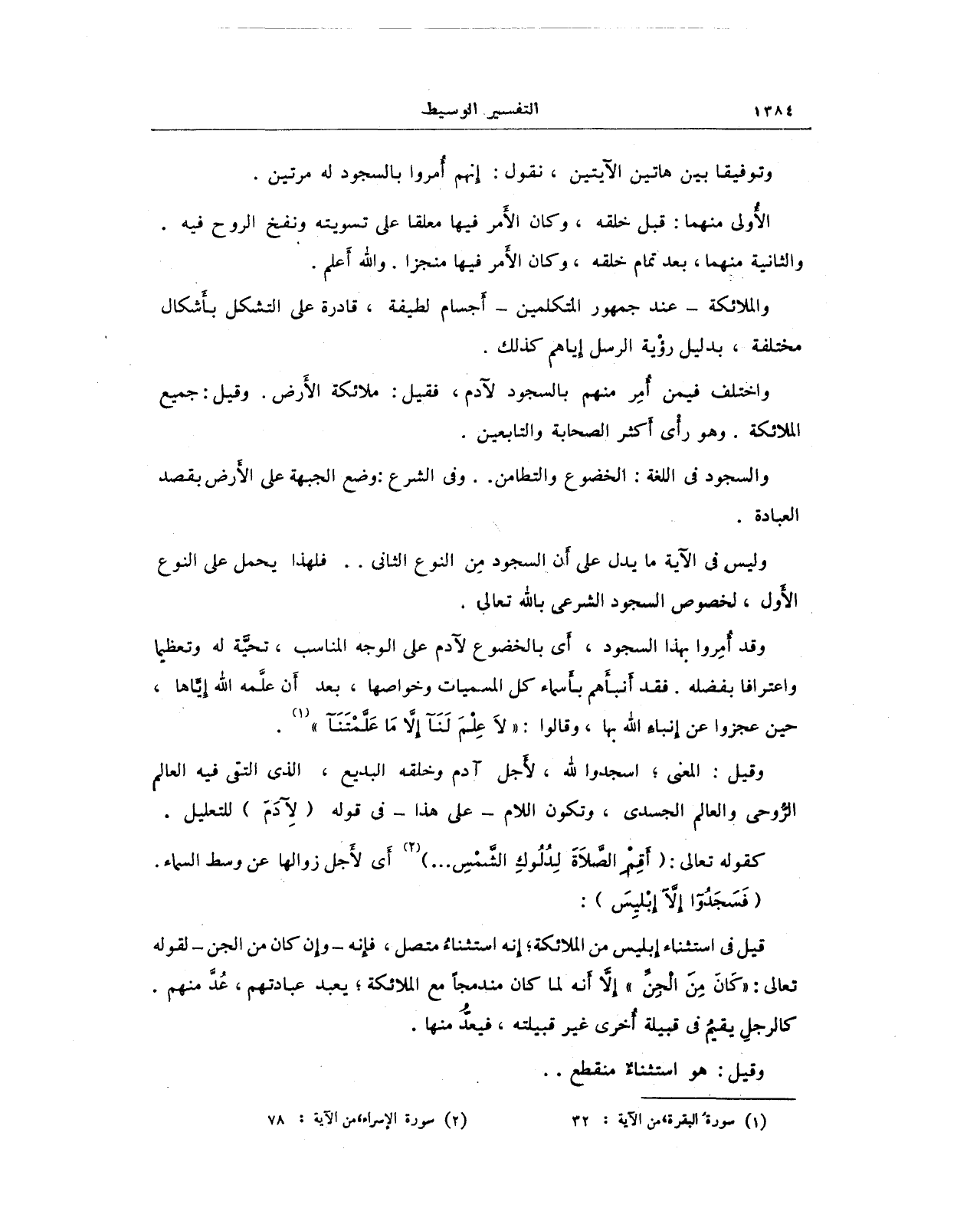 وقد أمِروا بهذا السجود، أَي بالخضوع لآدم على الوجه المناسب، تحيَّة له وتعظيما واعترافا بفضله. فقد أنبأَهم بأَسماء كل المسميات وخواصها، بعد أَن علَّمه الله إِيَّاها، حين عجزوا عن إِنباءِ الله بها، وقالوا: {لَا عِلْمَ لَنَا إِلَّا مَا عَلَّمْتَنَا} (¬1).