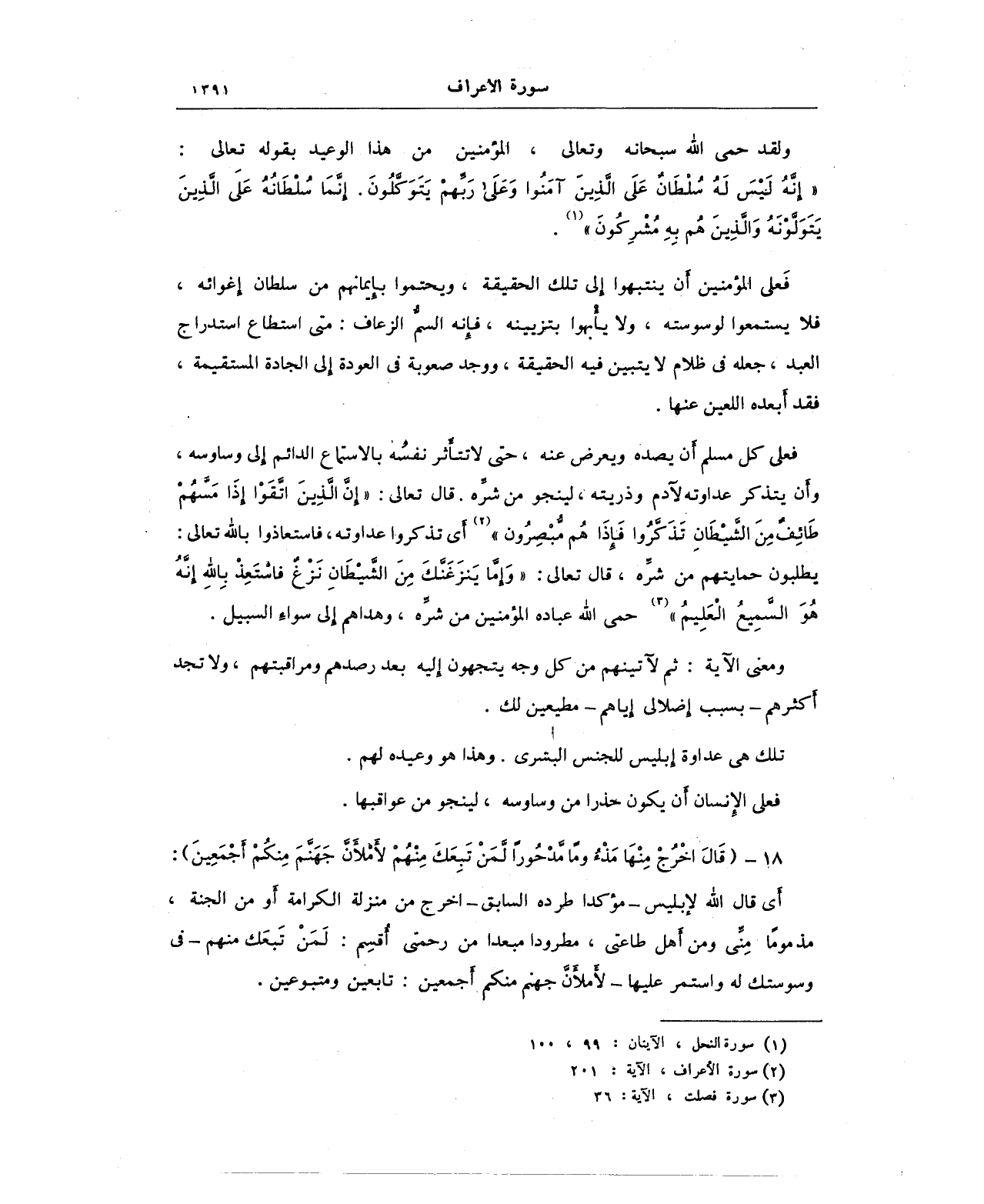 ولقد حمى الله سبحانه وتعالى، المؤمنين من هذا الوعيد بقوله تعالى: {إِنَّهُ لَيْسَ لَهُ سُلْطَانٌ عَلَى الَّذِينَ آمَنُوا وَعَلَى رَبِّهِمْ يَتَوَكَّلُونَ (99) إِنَّمَا سُلْطَانُهُ عَلَى الَّذِينَ يَتَوَلَّوْنَهُ وَالَّذِينَ هُمْ بِهِ مُشْرِكُونَ} (¬1).