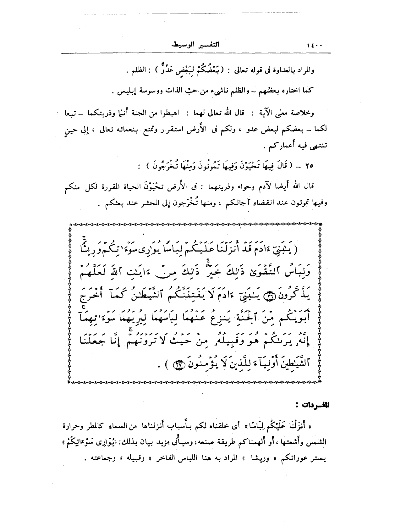 {أَنْزَلْنَا عَلَيْكُمْ لِبَاسًا} أي خلقناه لكم بأَسباب أنزلناها من السماءِ كالمطر وحرارة الشمس وأَشعتها، أَو ألهمناكم طريقة صنعه، وسيأْتى مزيد بيان بذلك: {يُوَارِي سَوْآتِكُمْ} يستر عوراتكم {وَرِيشًا} المراد به هنا اللباس الفاخر "وقبيله" وجماعته.