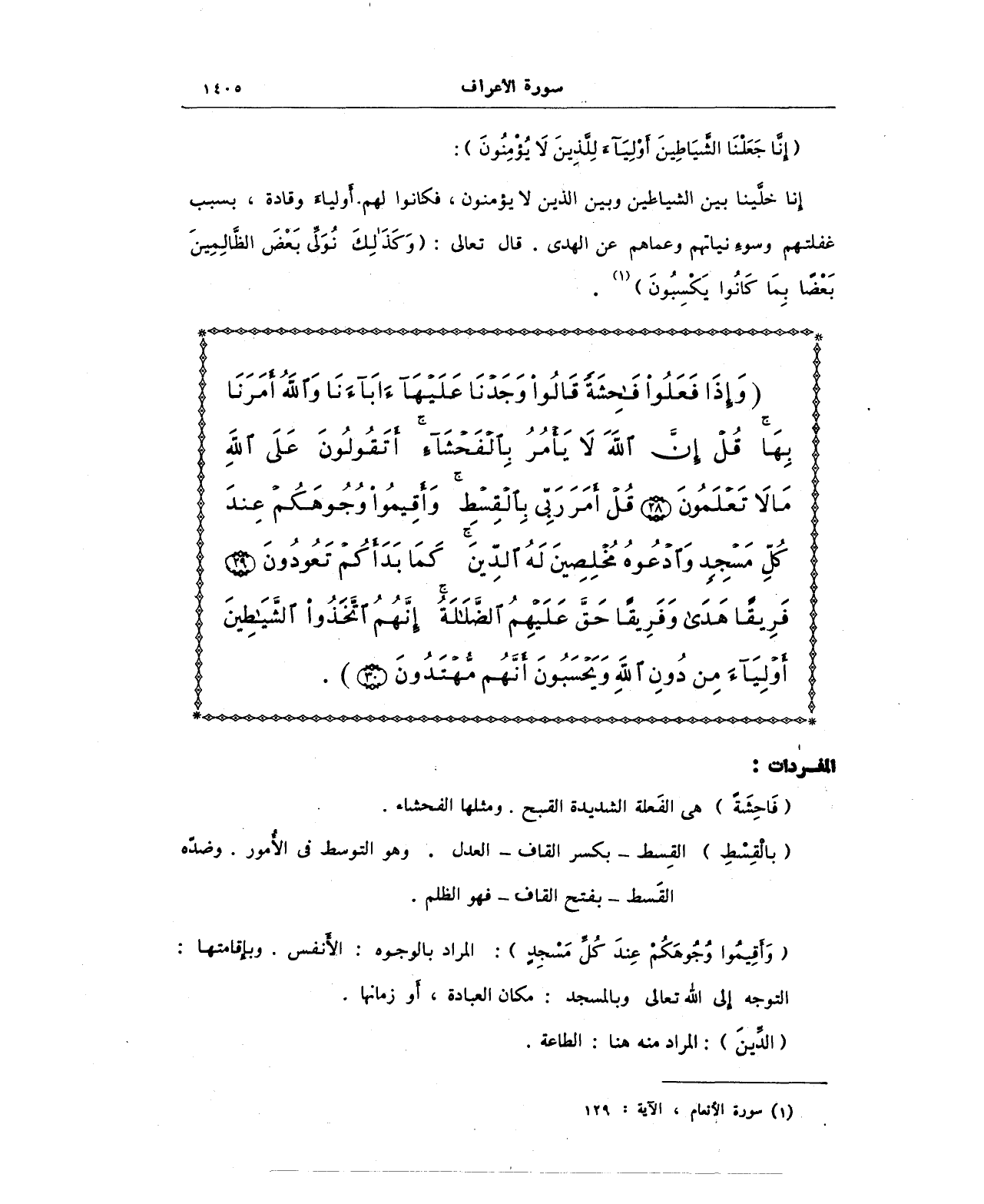 {وَإِذَا فَعَلُوا فَاحِشَةً قَالُوا وَجَدْنَا عَلَيْهَا آبَاءَنَا وَاللَّهُ أَمَرَنَا بِهَا قُلْ إِنَّ اللَّهَ لَا يَأْمُرُ بِالْفَحْشَاءِ أَتَقُولُونَ عَلَى اللَّهِ مَا لَا تَعْلَمُونَ (28) قُلْ أَمَرَ رَبِّي بِالْقِسْطِ وَأَقِيمُوا وُجُوهَكُمْ عِنْدَ كُلِّ مَسْجِدٍ وَادْعُوهُ مُخْلِصِينَ لَهُ الدِّينَ كَمَا بَدَأَكُمْ تَعُودُونَ (29) فَرِيقًا هَدَى وَفَرِيقًا حَقَّ عَلَيْهِمُ الضَّلَالَةُ إِنَّهُمُ اتَّخَذُوا الشَّيَاطِينَ أَوْلِيَاءَ مِنْ دُونِ اللَّهِ وَيَحْسَبُونَ أَنَّهُمْ مُهْتَدُونَ (30)}.