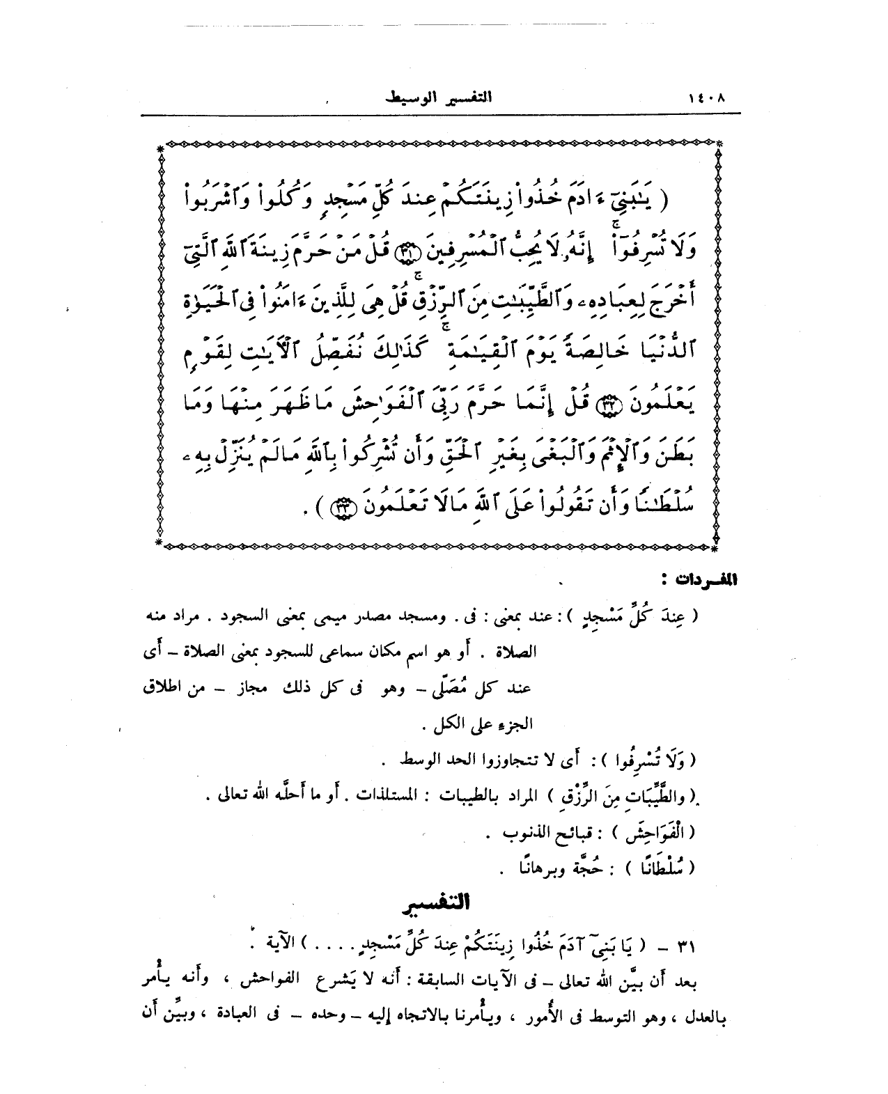 {يَا بَنِي آدَمَ خُذُوا زِينَتَكُمْ عِنْدَ كُلِّ مَسْجِدٍ وَكُلُوا وَاشْرَبُوا وَلَا تُسْرِفُوا إِنَّهُ لَا يُحِبُّ الْمُسْرِفِينَ (31) قُلْ مَنْ حَرَّمَ زِينَةَ اللَّهِ الَّتِي أَخْرَجَ لِعِبَادِهِ وَالطَّيِّبَاتِ مِنَ الرِّزْقِ قُلْ هِيَ لِلَّذِينَ آمَنُوا فِي الْحَيَاةِ الدُّنْيَا خَالِصَةً يَوْمَ الْقِيَامَةِ كَذَلِكَ نُفَصِّلُ الْآيَاتِ لِقَوْمٍ يَعْلَمُونَ (32) قُلْ إِنَّمَا حَرَّمَ رَبِّيَ الْفَوَاحِشَ مَا ظَهَرَ مِنْهَا وَمَا بَطَنَ وَالْإِثْمَ وَالْبَغْيَ بِغَيْرِ الْحَقِّ وَأَنْ تُشْرِكُوا بِاللَّهِ مَا لَمْ يُنَزِّلْ بِهِ سُلْطَانًا وَأَنْ تَقُولُوا عَلَى اللَّهِ مَا لَا تَعْلَمُونَ (33)}.