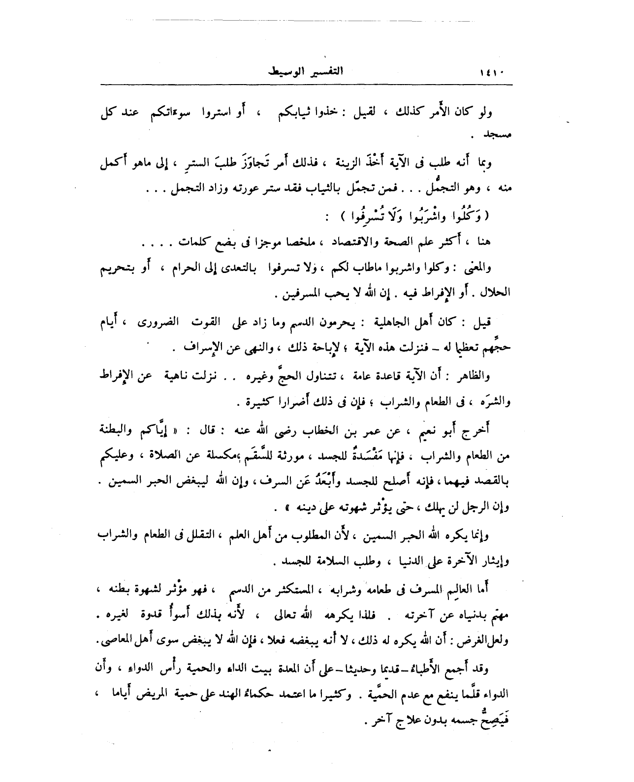 أَخرج أبو نعيم، عن عمر بن الخطاب رضي الله عنه: قال: "إِيَّاكم والبطنة من الطعام والشراب، فإنها مَفْسَدة للجسد، مورثة للسَّقَم، مكسلة عن الصلاة، وعليكم بالقصد فيهما، فإنه أَصلح للجسد وأَبْعَدُ عَن المسرف، وإِن الله ليبغض الحبر السمين. وإِن الرجل لن يهلك، حتى يؤثر شهوته على دينه".