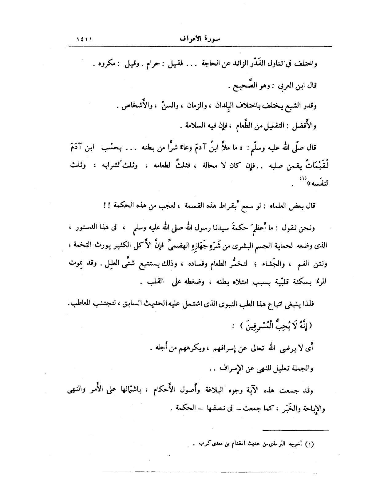 ونحن نقول: ما أَعظمَ حكمةَ سيدنا رسول الله - صلى الله عليه وسلم -، في هذا الدستور، الذي وضعه لحماية الجسم البشرى من شَرَهِ جَهَازِهِ الهضمىِّ فإنَّ الأكل الكثير يورث التخمة، ونتن الفم، والجَشاء؛ لتخمُّر الطعام وفساده، وذلك يستتبع شتَّى العلِل. وقد يموت المرءُ بسكتة قلبّية بسبب امتلاء بطنه، وضغطه على القلب.