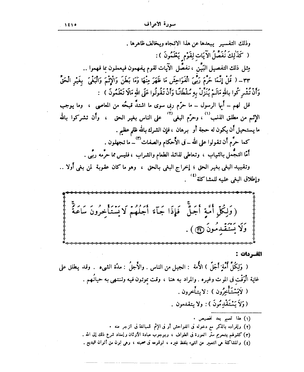 {وَلِكُلِّ أُمَّةٍ أَجَلٌ} الأُمة: الجيل من الناس. والأَجلُ: مدّة الشىء. وتد يطلق على غاية الوَقْتِ في الموت وغيره. والمراد به هنا، وقت يموتون فيه وتنتهى به حياتُهم.