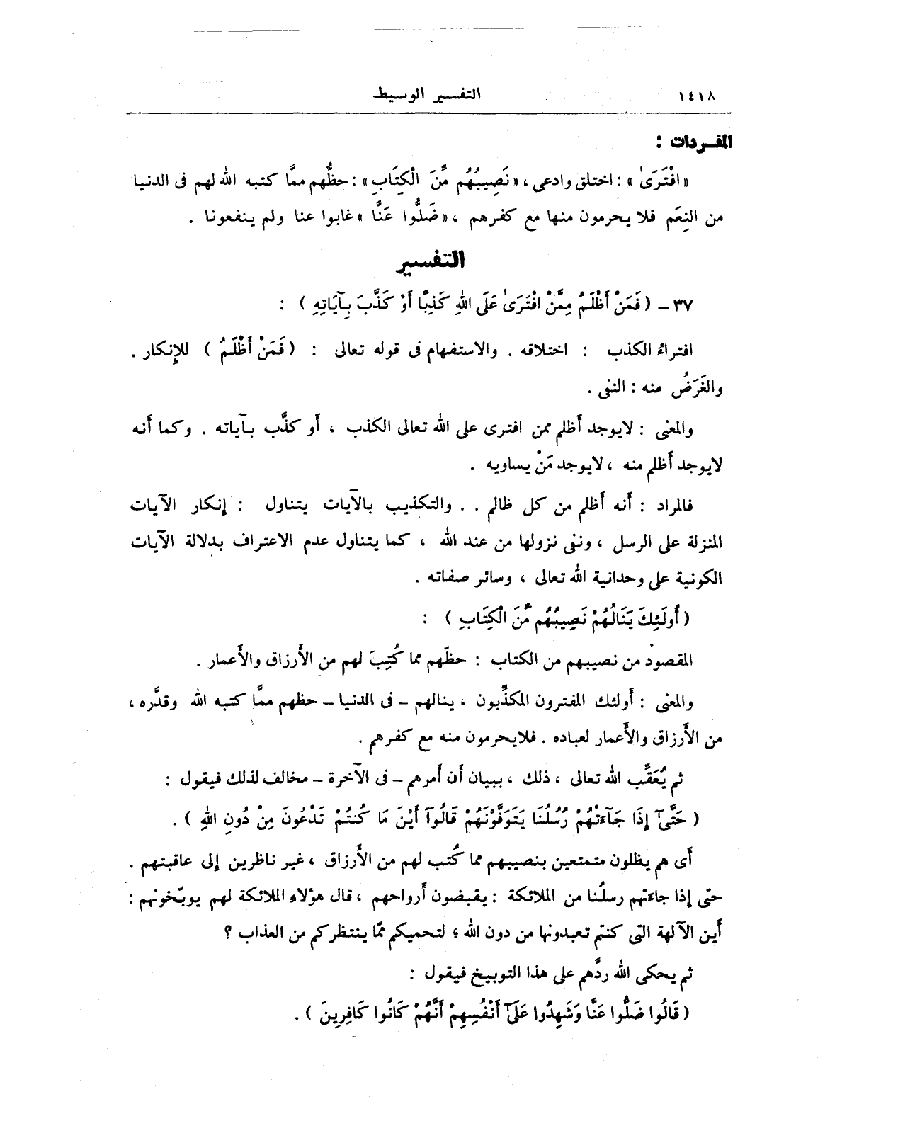 {افْتَرَى}: اختلق وادعى، {نَصِيبُهُمْ مِنَ الْكِتَابِ}: حظُّهم ممَّا كتبه الله لهم في الدنيا من النِعَم فلا يحرمون منها مع كفرهم، {ضَلُّوا عَنَّا} غابوا عنا ولم ينفعونا.