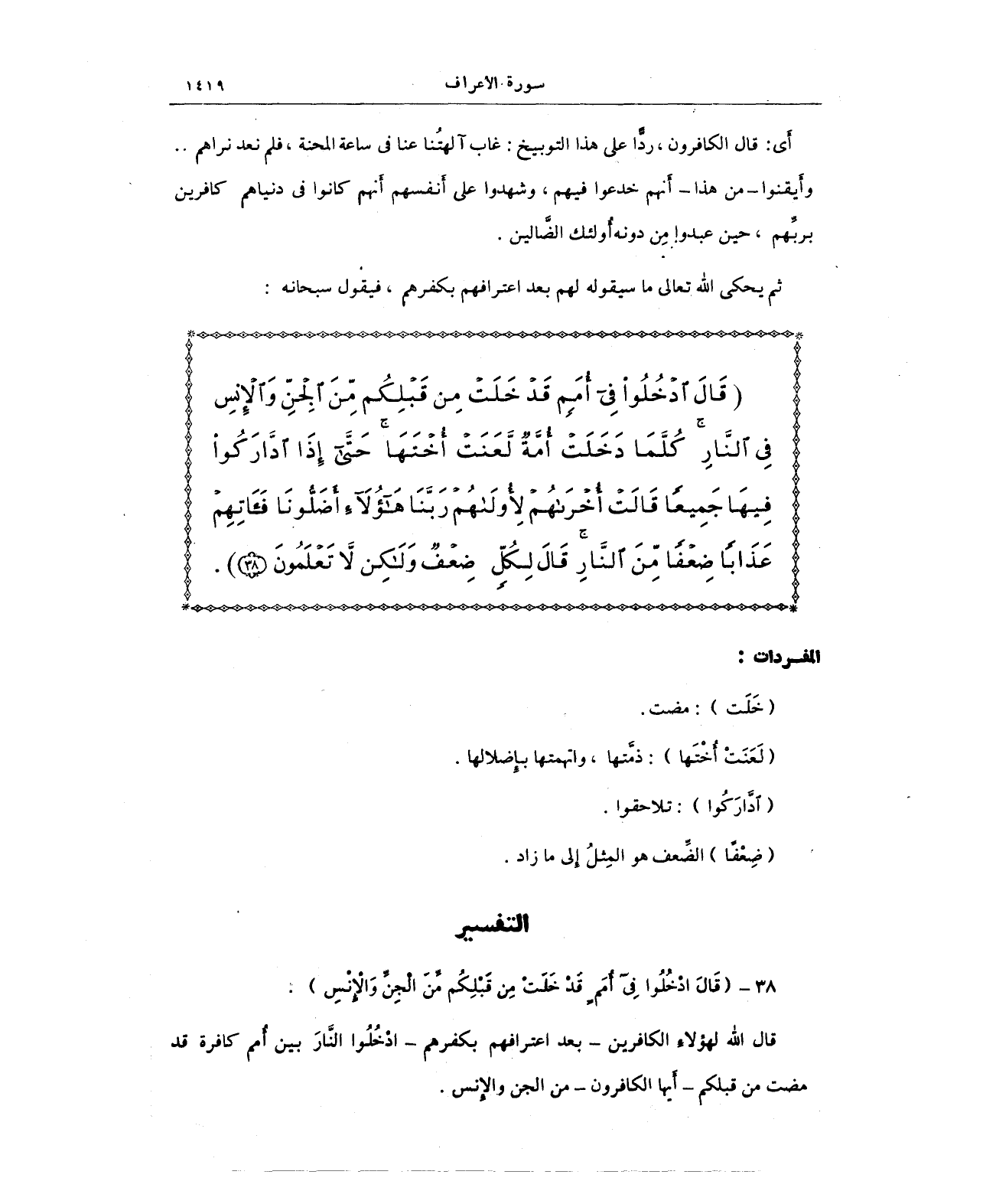 {قَالَ ادْخُلُوا فِي أُمَمٍ قَدْ خَلَتْ مِنْ قَبْلِكُمْ مِنَ الْجِنِّ وَالْإِنْسِ فِي النَّارِ كُلَّمَا دَخَلَتْ أُمَّةٌ لَعَنَتْ أُخْتَهَا حَتَّى إِذَا ادَّارَكُوا فِيهَا جَمِيعًا قَالَتْ أُخْرَاهُمْ لِأُولَاهُمْ رَبَّنَا هَؤُلَاءِ أَضَلُّونَا فَآتِهِمْ عَذَابًا ضِعْفًا مِنَ النَّارِ قَالَ لِكُلٍّ ضِعْفٌ وَلَكِنْ لَا تَعْلَمُونَ (38)}.