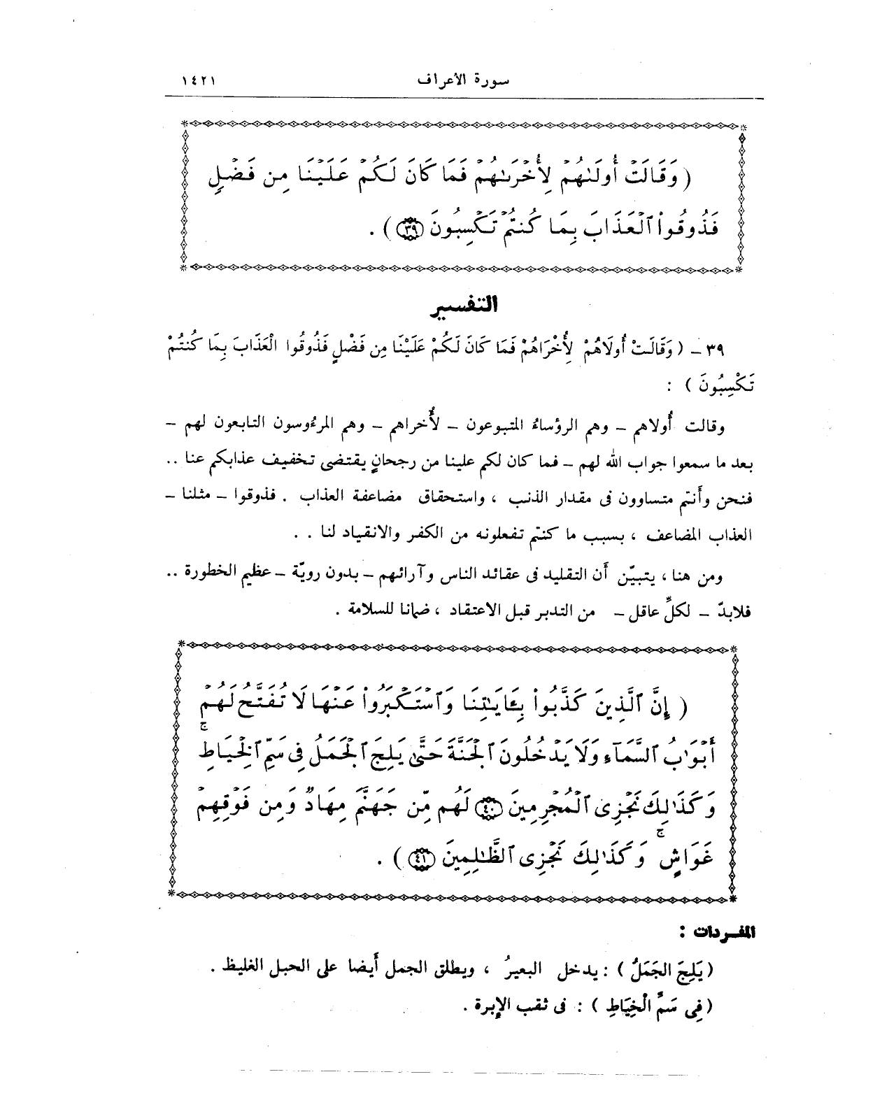 {إِنَّ الَّذِينَ كَذَّبُوا بِآيَاتِنَا وَاسْتَكْبَرُوا عَنْهَا لَا تُفَتَّحُ لَهُمْ أَبْوَابُ السَّمَاءِ وَلَا يَدْخُلُونَ الْجَنَّةَ حَتَّى يَلِجَ الْجَمَلُ فِي سَمِّ الْخِيَاطِ وَكَذَلِكَ نَجْزِي الْمُجْرِمِينَ (40) لَهُمْ مِنْ جَهَنَّمَ مِهَادٌ وَمِنْ فَوْقِهِمْ غَوَاشٍ وَكَذَلِكَ نَجْزِي الظَّالِمِينَ (41)}.