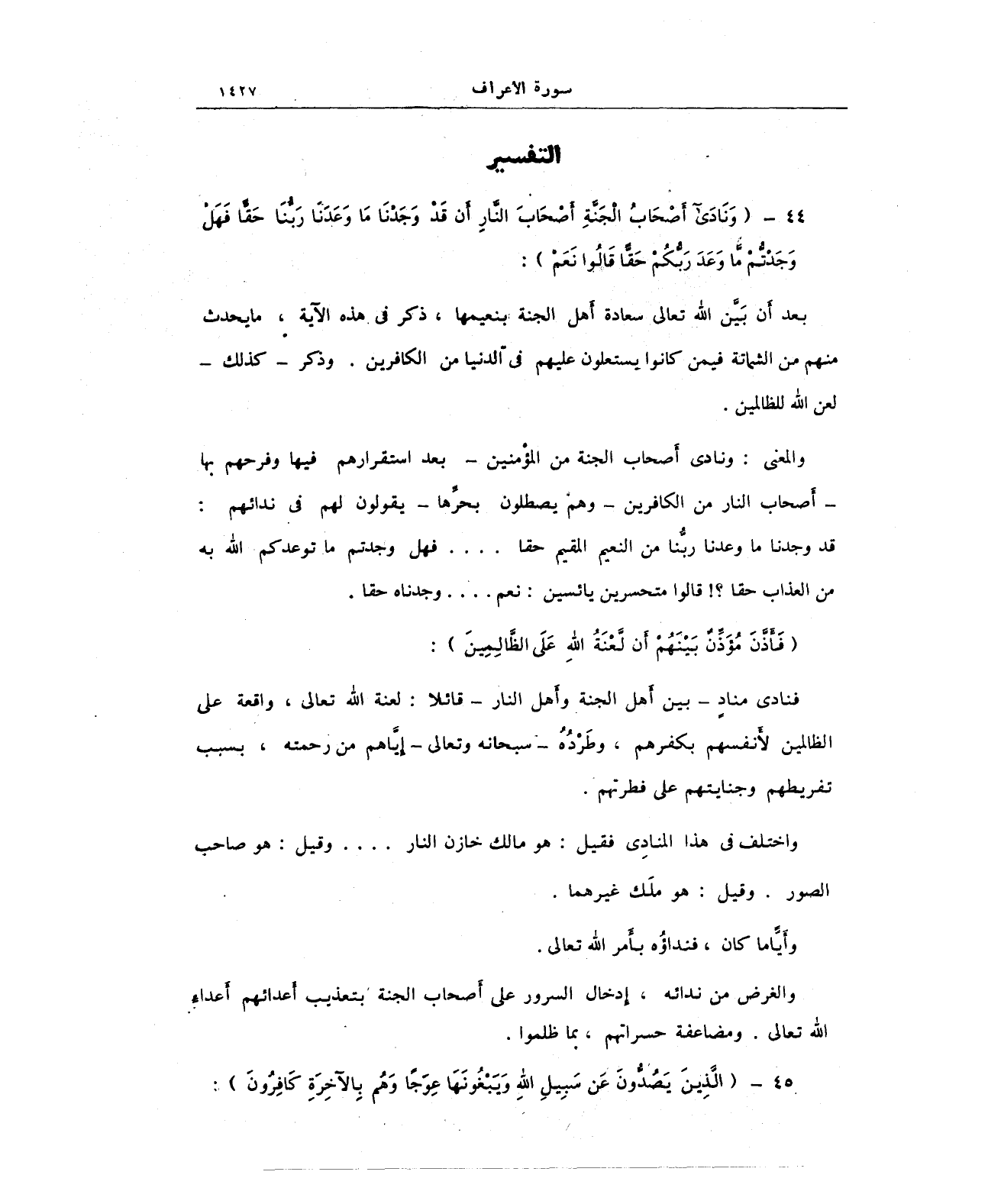 44 - {وَنَادَى أَصْحَابُ الْجَنَّةِ أَصْحَابَ النَّارِ أَنْ قَدْ وَجَدْنَا مَا وَعَدَنَا رَبُّنَا حَقًّا فَهَلْ وَجَدْتُمْ مَا وَعَدَ رَبُّكُمْ حَقًّا قَالُوا نَعَمْ}: