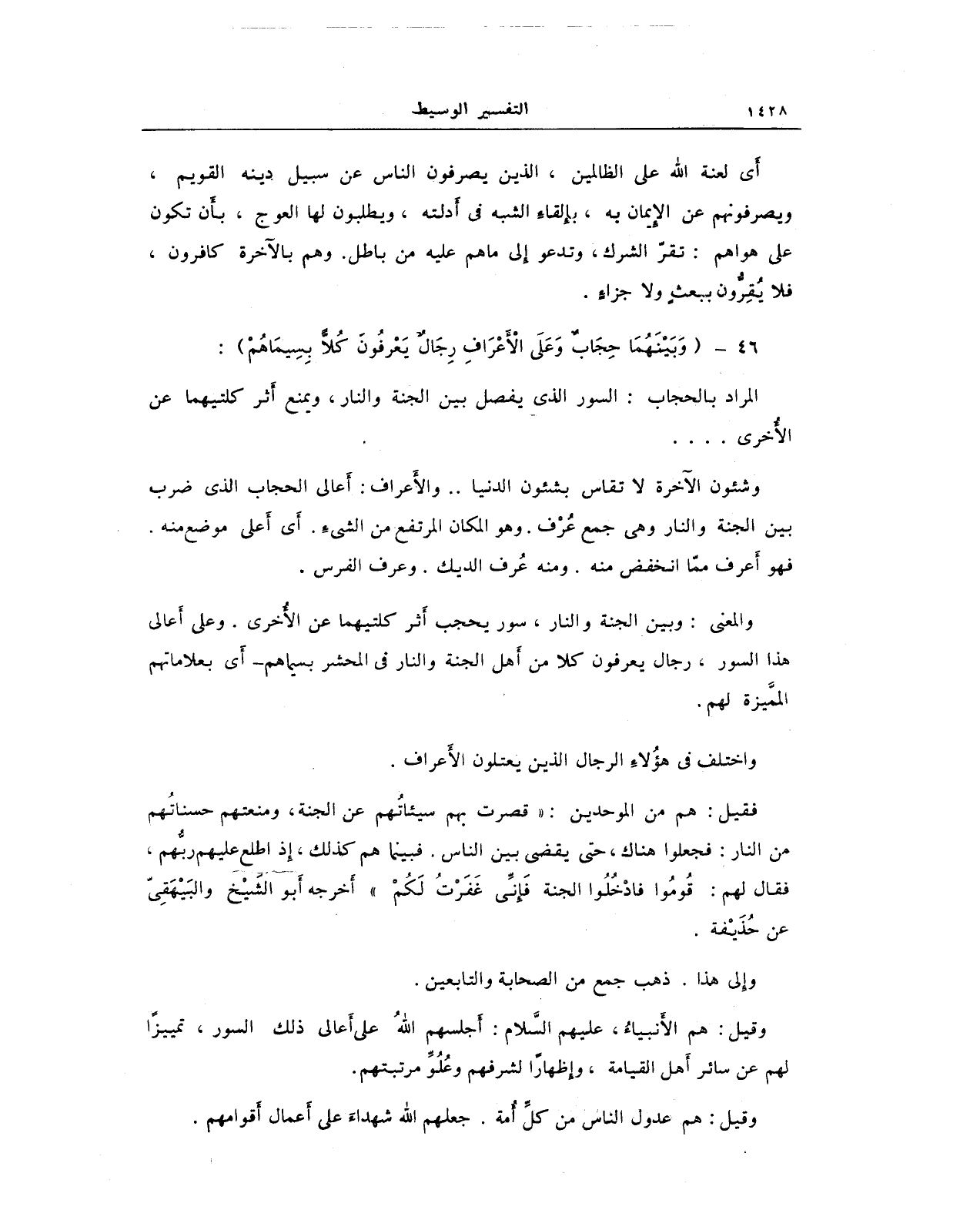 وشئون الآخرة لا تقاس بشئون الدنيا .. والأَعراف: أَعالى الحجاب الذي ضرب بين الجنة والنار وهي جمع عُرْف. وهو المكان المرتفع من الشىءِ. أَي أَعلى موضع منه. فهو أَعرف ممّا انخفض منه. ومنه عُرف الديك. وعرف الفرس.