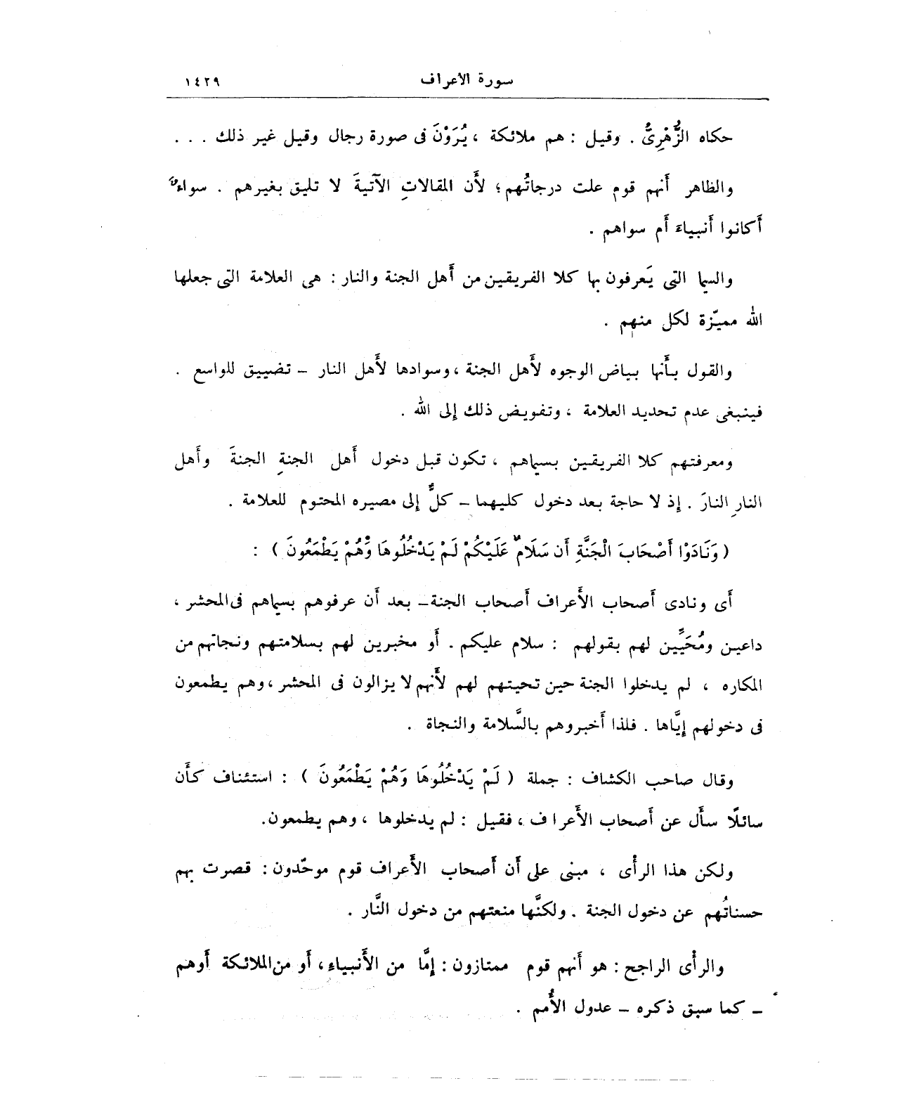 ولكن هذا الرأْى، مبنى على أن أصحاب الأعراف قوم موحّدون: قصرت بهم حسناتُهم عن دخول الجنة. ولكنَّها منعتهم من دخول النَّار.
