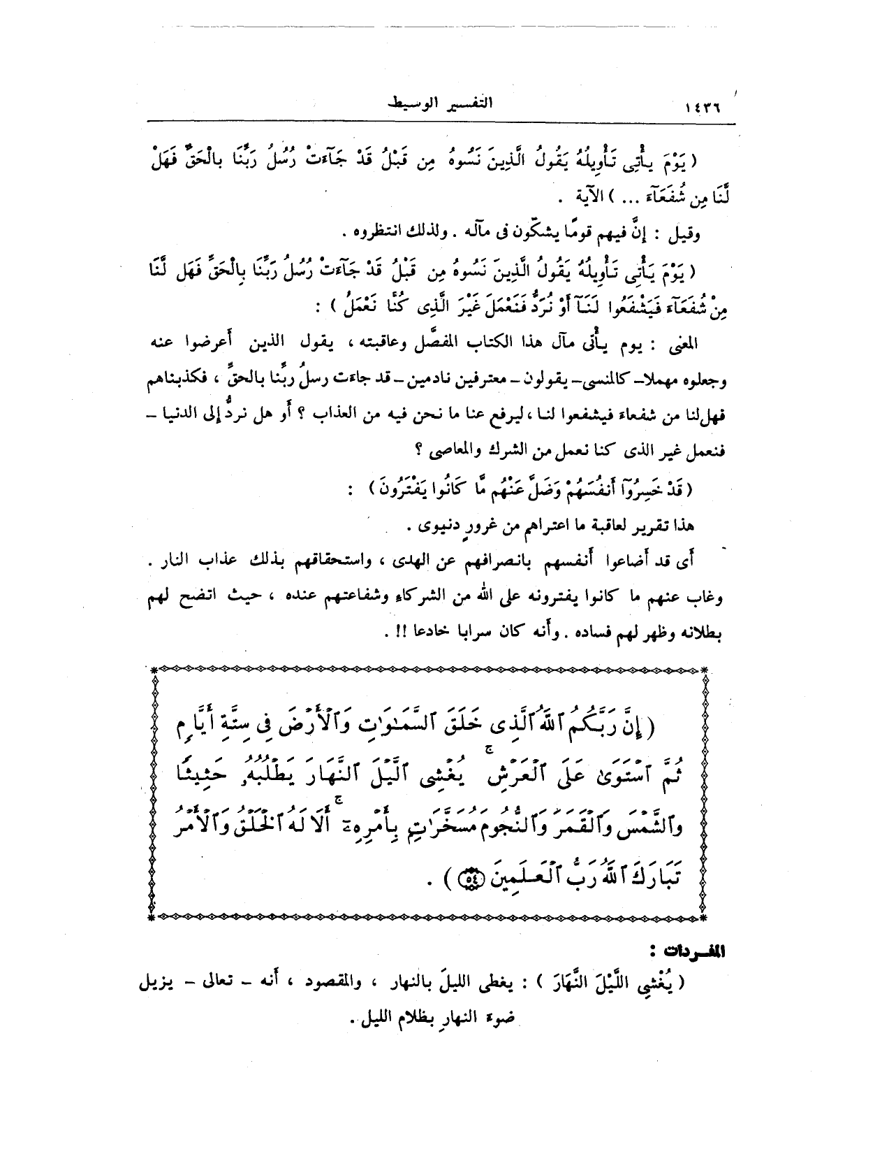 المعنى: يوم يأتى مآل هذا الكتاب المفصَّل وعاقبته، يقول الذين أعرضوا عنه وجعلوه مهملا - كالمنسى - يقولون - معترفين نادمين - قد جاءَت رسلُ ربِّنا بالحقِّ، فكذبناهم فهل لنا من شفعاءَ فيشفعوا لنا، ليرفع عنا ما نحن فيه من العذاب؟ أو هل نردُّ إِلى الدنيا - فنعمل غير الذي كنا نعمل من الشرك والمعاصي؟