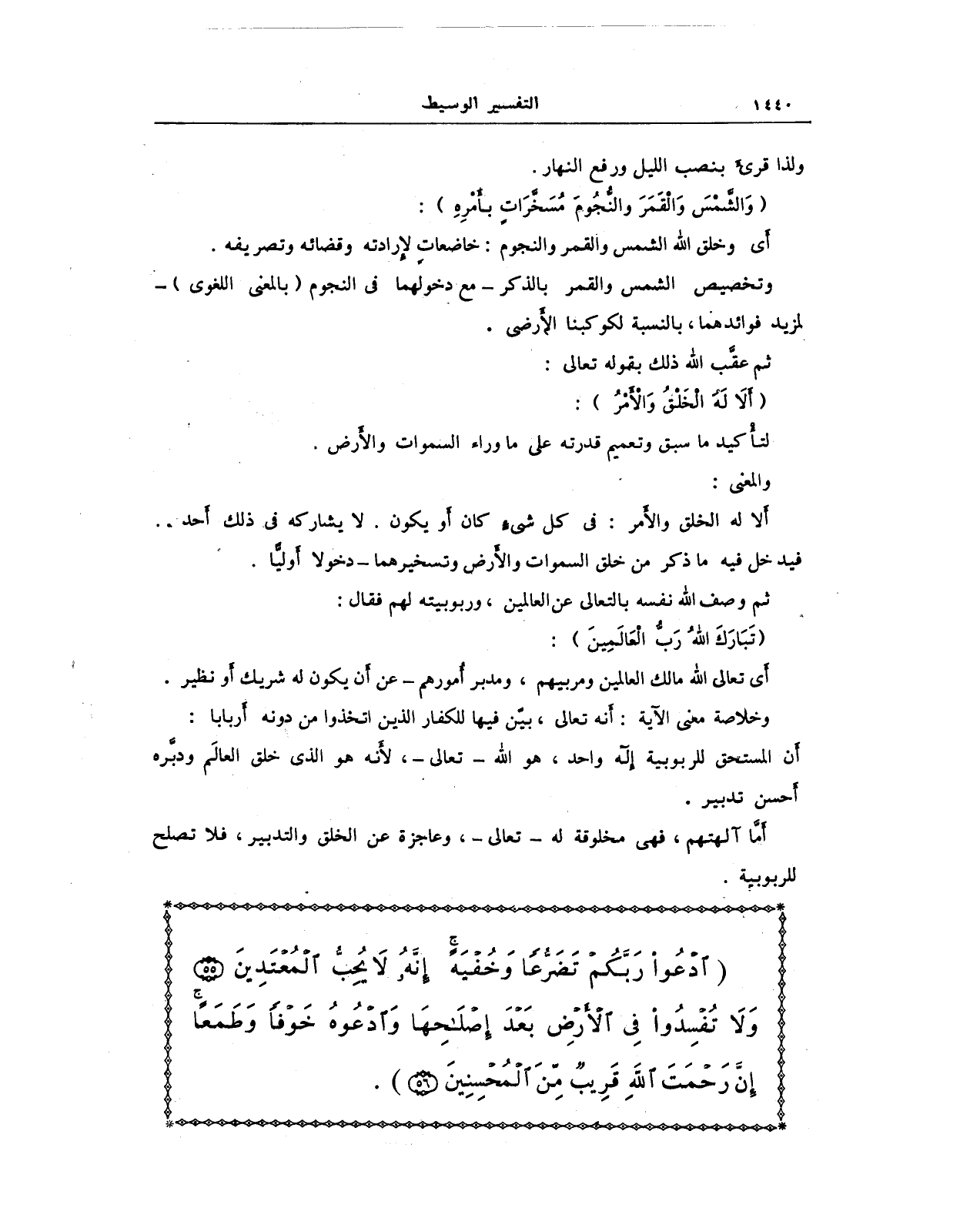 ألا له الخلق والأمر: في كل شيءٍ كان أَو يكون. لا يشاركه في ذلك أَحد .. فيدخل فيه ما ذكر من خلق السموات والأَرض وتسخيرهما - دخولا أَوليًّا.