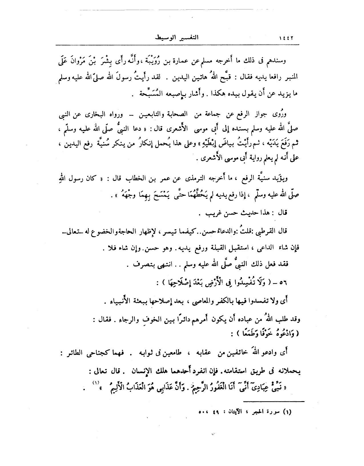ورُوى جواز الرفع عن جماعة من الصحابة والتابعين - ورواه البخاري عن النبي - صلى الله عليه وسلم - بسنده إلى أبي موسى الأشعرى قال: "دعا النبيُّ - صلى الله عليه وسلم -، ثم رَفَعَ يَدَيْه، ثم رأيْتُ بياضَ إِبْطَيْهِ" وعلى هذا يُحمل إِنكارُ من ينكر سُنيَّة رفع اليدين، على أَنه لم يعلم رواية أَبي موسى الأشعرى.