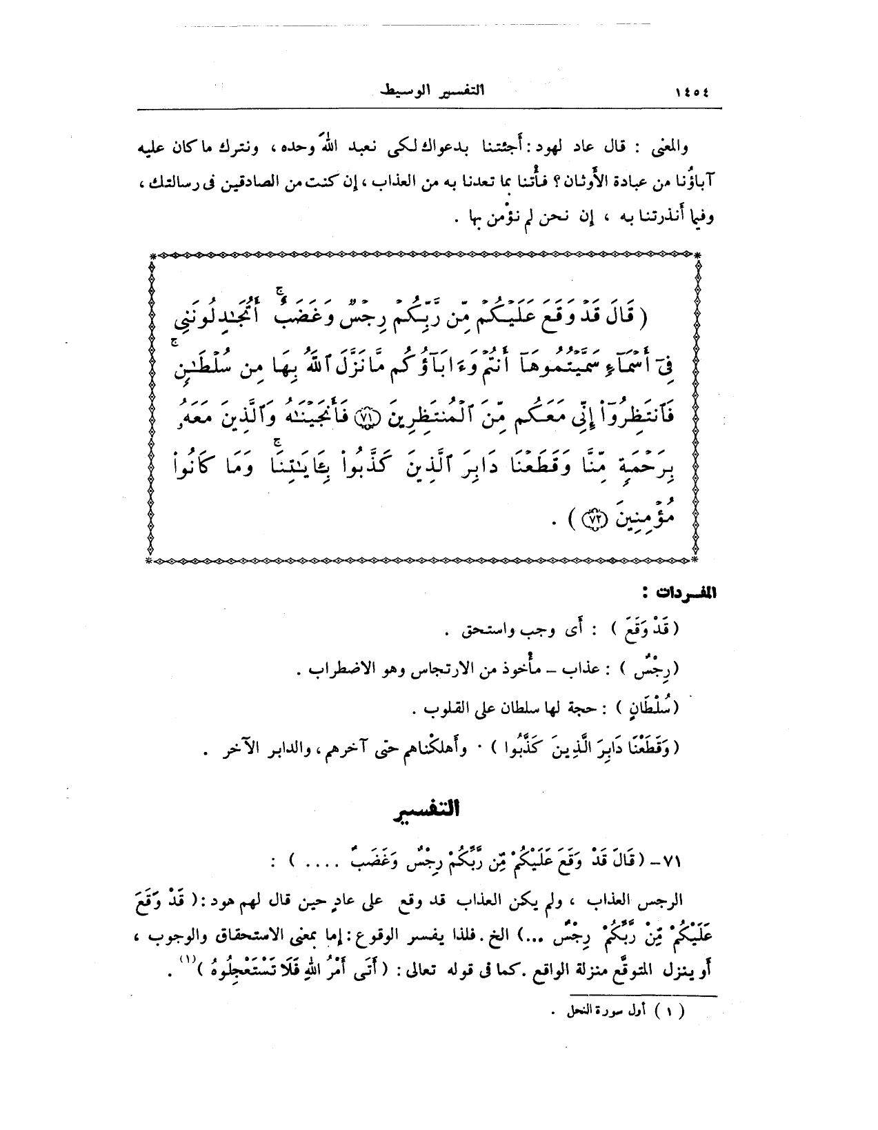 الرجس العذاب، ولم يكن العذاب قد وقع على عادٍ حين قال لهم هود: {قَدْ وَقَعَ عَلَيْكُمْ مِنْ رَبِّكُمْ رِجْسٌ ... } الخ. فلذا يفسر الوقوع: إِما بمعنى الاستحقاق والوجوب، أَو ينزل المتوقَّع منزلة الواقع. كما في قوله تعالى: (أتَى أَمْرُ اللهِ فلَا تَسْتَعْجِلُوهُ) (¬1).