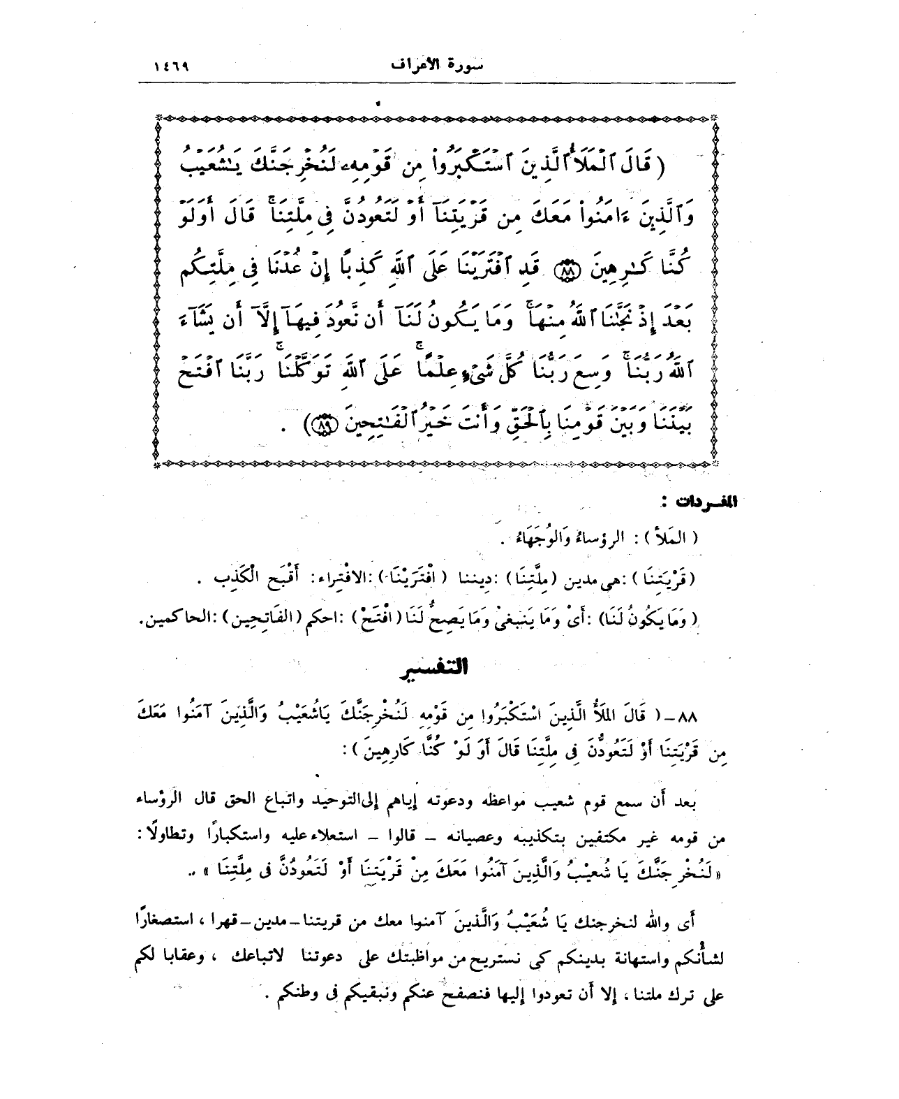 {قَالَ الْمَلَأُ الَّذِينَ اسْتَكْبَرُوا مِنْ قَوْمِهِ لَنُخْرِجَنَّكَ يَا شُعَيْبُ وَالَّذِينَ آمَنُوا مَعَكَ مِنْ قَرْيَتِنَا أَوْ لَتَعُودُنَّ فِي مِلَّتِنَا قَالَ أَوَلَوْ كُنَّا كَارِهِينَ (88) قَدِ افْتَرَيْنَا عَلَى اللَّهِ كَذِبًا إِنْ عُدْنَا فِي مِلَّتِكُمْ بَعْدَ إِذْ نَجَّانَا اللَّهُ مِنْهَا وَمَا يَكُونُ لَنَا أَنْ نَعُودَ فِيهَا إِلَّا أَنْ يَشَاءَ اللَّهُ رَبُّنَا وَسِعَ رَبُّنَا كُلَّ شَيْءٍ عِلْمًا عَلَى اللَّهِ تَوَكَّلْنَا رَبَّنَا افْتَحْ بَيْنَنَا وَبَيْنَ قَوْمِنَا بِالْحَقِّ وَأَنْتَ خَيْرُ الْفَاتِحِينَ (89)}.