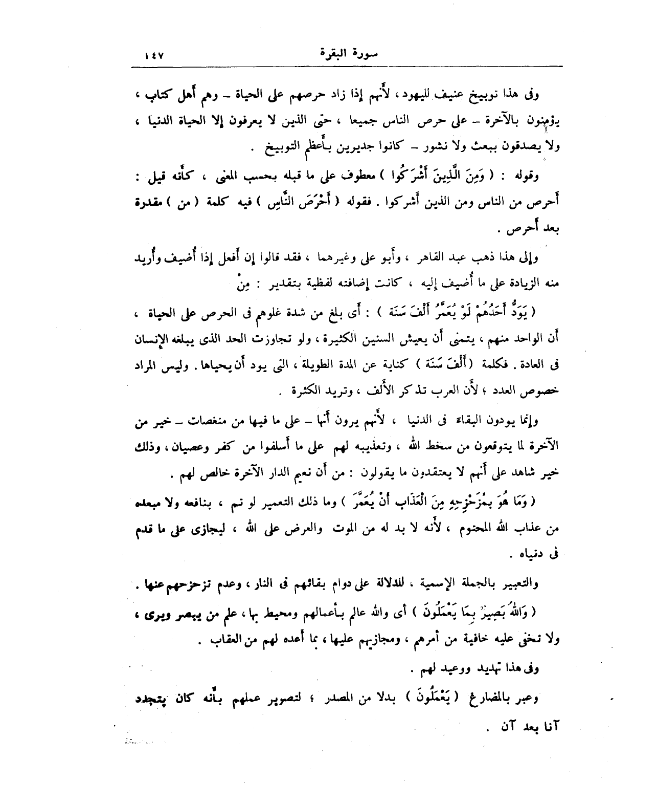 {يَوَدُّ أَحَدُهُمْ لَوْ يُعَمَّرُ أَلْفَ سَنَةٍ}: أَي بلغ من: مدة غلوهم في الحرص على الحياة، أن الواحد منهم، يتمنى أن يعيش السنين الكثيرة، ولو تجاوزت الحد الذي يبلغه الإنسان في العادة. فكلمة (أَلفَ سَنَة) كناية عن المدة الطويلة، التي يود أن يحياها. وليس المراد خصوص العدد؛ لأَن العرب تذكر الأَلف، وتريد الكثرة.