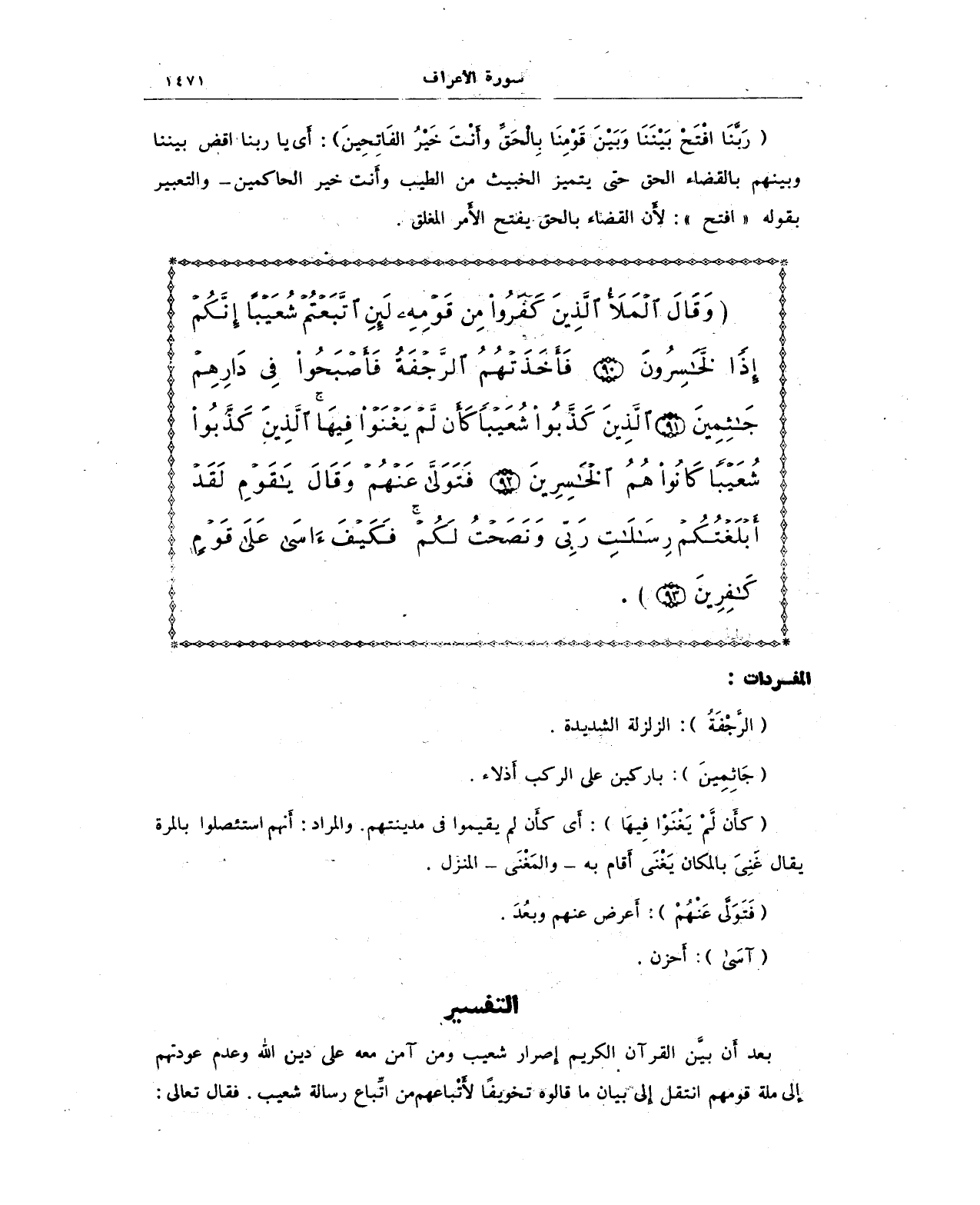 {وَقَالَ الْمَلَأُ الَّذِينَ كَفَرُوا مِنْ قَوْمِهِ لَئِنِ اتَّبَعْتُمْ شُعَيْبًا إِنَّكُمْ إِذًا لَخَاسِرُونَ (90) فَأَخَذَتْهُمُ الرَّجْفَةُ فَأَصْبَحُوا فِي دَارِهِمْ جَاثِمِينَ (91) الَّذِينَ كَذَّبُوا شُعَيْبًا كَأَنْ لَمْ يَغْنَوْا فِيهَا الَّذِينَ كَذَّبُوا شُعَيْبًا كَانُوا هُمُ الْخَاسِرِينَ (92) فَتَوَلَّى عَنْهُمْ وَقَالَ يَا قَوْمِ لَقَدْ أَبْلَغْتُكُمْ رِسَالَاتِ رَبِّي وَنَصَحْتُ لَكُمْ فَكَيْفَ آسَى عَلَى قَوْمٍ كَافِرِينَ (93)}.