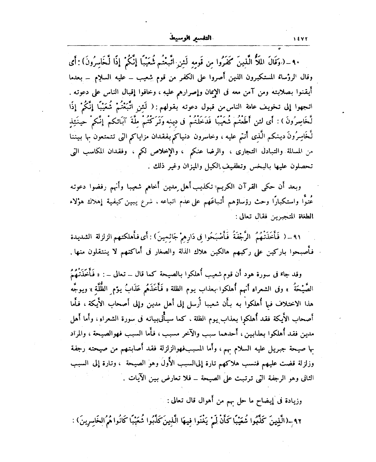 90 - {وَقَالَ الْمَلَأُ الَّذِينَ كَفَرُوا مِنْ قَوْمِهِ لَئِنِ اتَّبَعْتُمْ شُعَيْبًا إِنَّكُمْ إِذًا لَخَاسِرُونَ}: أَي وقال الرؤساءُ المستكبرون الذين أصروا على الكفر من قوم شعيب - عليه السلام - بعدما أَيقنوا بصلابته ومن آمن معه في الإيمان وإِصرارهم عليه، وخافوا إقبال الناس على دعوته. اتجهوا إِلى تخويف عامة الناس من قبول دعوته بقولهم: {لَئِنِ اتَّبَعْتُمْ شُعَيْبًا إِنَّكُمْ إِذًا لَخَاسِرُونَ}: أي لئن اطَعْتُم شُعَيبًا فَدَخَلْتُمْ في دِينِه وَتَرَكتُمْ مِلَّةَ آبَائكمْ إنَّكْم حينَئِذٍ لخَاسِرُونَ دينكم الَّذِى أَنتم عليه، وخاسرون دنياكم بفقدان مزاياكم التي تتمتعون بها بيننا في المسالمة والتبادل التجارى، والرضا عنكم، والإخلاص لكم، وفقدان المكاسب التي تحصلون عليها بالبخس وتطفيف الكيل والميزان وغير ذلك.