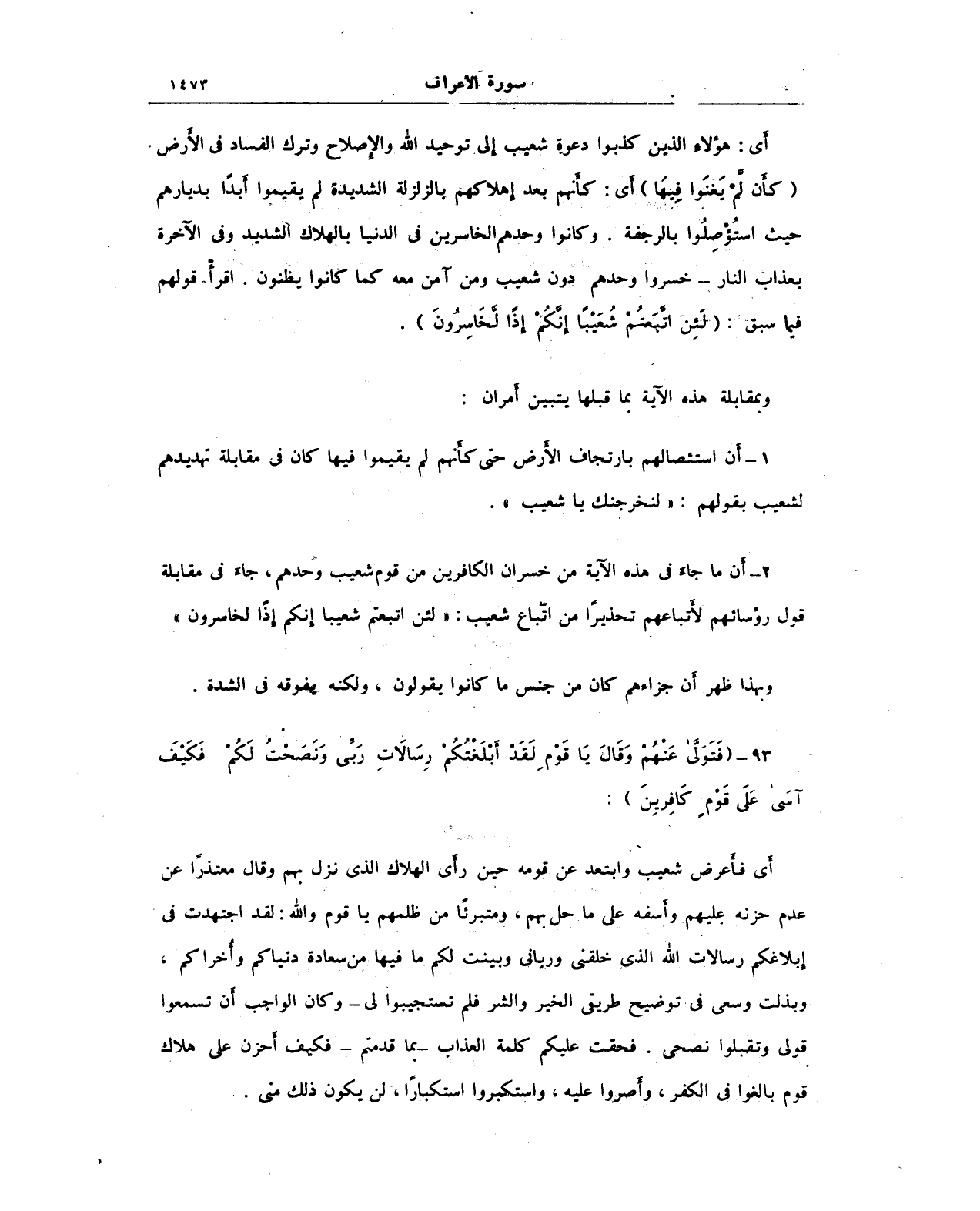 أي فأَعرض شعيب وابتعد عن قومه حين رأَى الهلاك الذي نزل بهم وقال معتذرًا عن عدم حزنه عليهم وأَسفه على ما حل بهم، ومتبرئًا من ظلمهم يا قوم والله: لقد اجتهدت في إبلاغكم رسالات الله الذي خلقنى وربانى وبينت لكم ما فيها من سعادة دنياكم وأُخرا كم، وبذلت وسعى في توضيح طريقى الخير والشر فلم تستجيبوا لي - وكان الواجب أن تسمعوا قولى وتقبلوا نصحى. فحقت عليكم كلمة العذاب - بما قدمتم - فكيف أحزن على هلاك قوم بالغوا في الكفر، وأصروا عليه، واستكبروا استكبارًا، لن يكون ذلك مني.