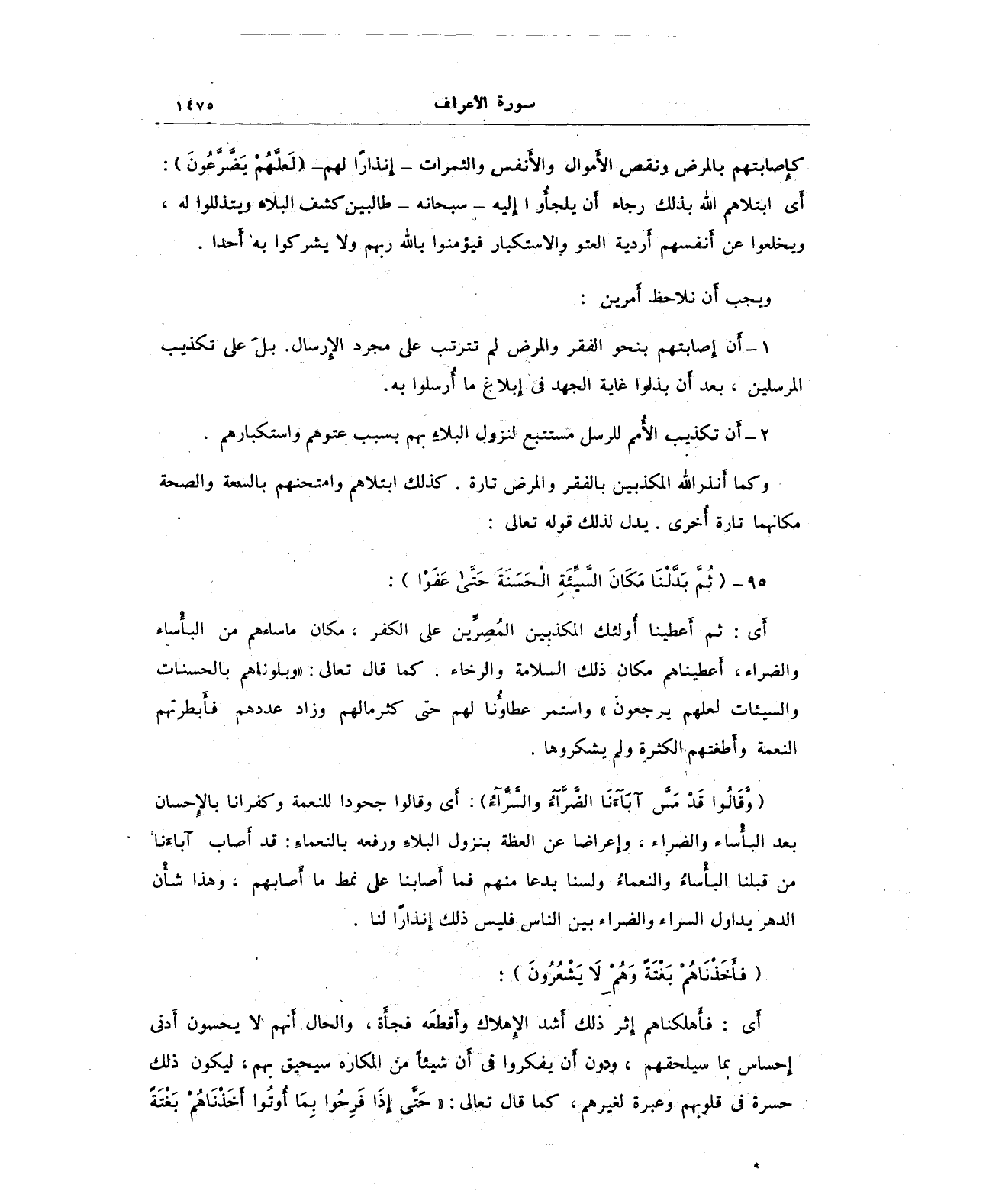 1 - أَن إِصابتهم بنحو الفقر والمرض لم تترتب على مجرد الإرسال. بل على تكذيب المرسلين، بعد أَن بذلوا غاية الجهد في إِبلاغ ما أُرسلوا به.