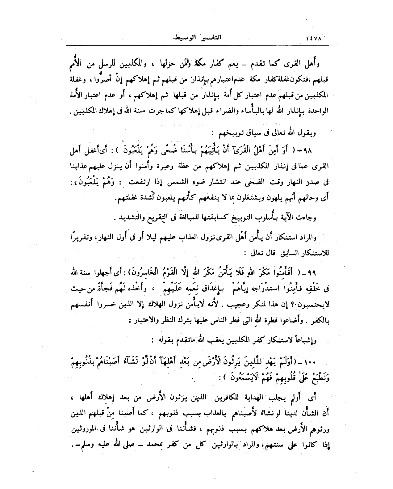 98 - {أَوَأَمِنَ أَهْلُ الْقُرَى أَنْ يَأْتِيَهُمْ بَأْسُنَا ضُحًى وَهُمْ يَلْعَبُونَ}: أَي أَغفل أَهل القرى عما في إِنذار المكذبين ثم إهلاكهم من عظة وعبرة وأَمنوا أَن ينزل عليهم عذابنا في صدر النهار وقت الضحى عند انتشار ضوءِ الشمس إِذا ارتفعت {وَهُمْ يَلْعَبُونَ}: أي وحالهم أنهم يلهون ويشتغلون بما لا ينفعهم كأنهم يلعبون لشدة غفلتهم.