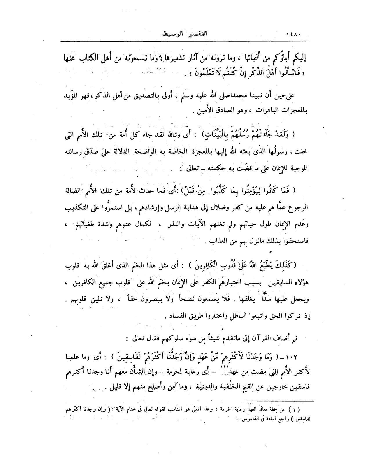 102 - {وَمَا وَجَدْنَا لِأَكْثَرِهِمْ مِنْ عَهْدٍ وَإِنْ وَجَدْنَا أَكْثَرَهُمْ لَفَاسِقِينَ}: أي وما علمنا لأَكثر الأُمم إلتى مضت من عهد (¬1) - أَي رعاية لحرمة - وإن الشأْن معهم أنا وجدنا أَكثرهم فاسقين خارجين عن القيم الخلُقية والدينية، وما آمن وأَصلح منهم إلا قليل.