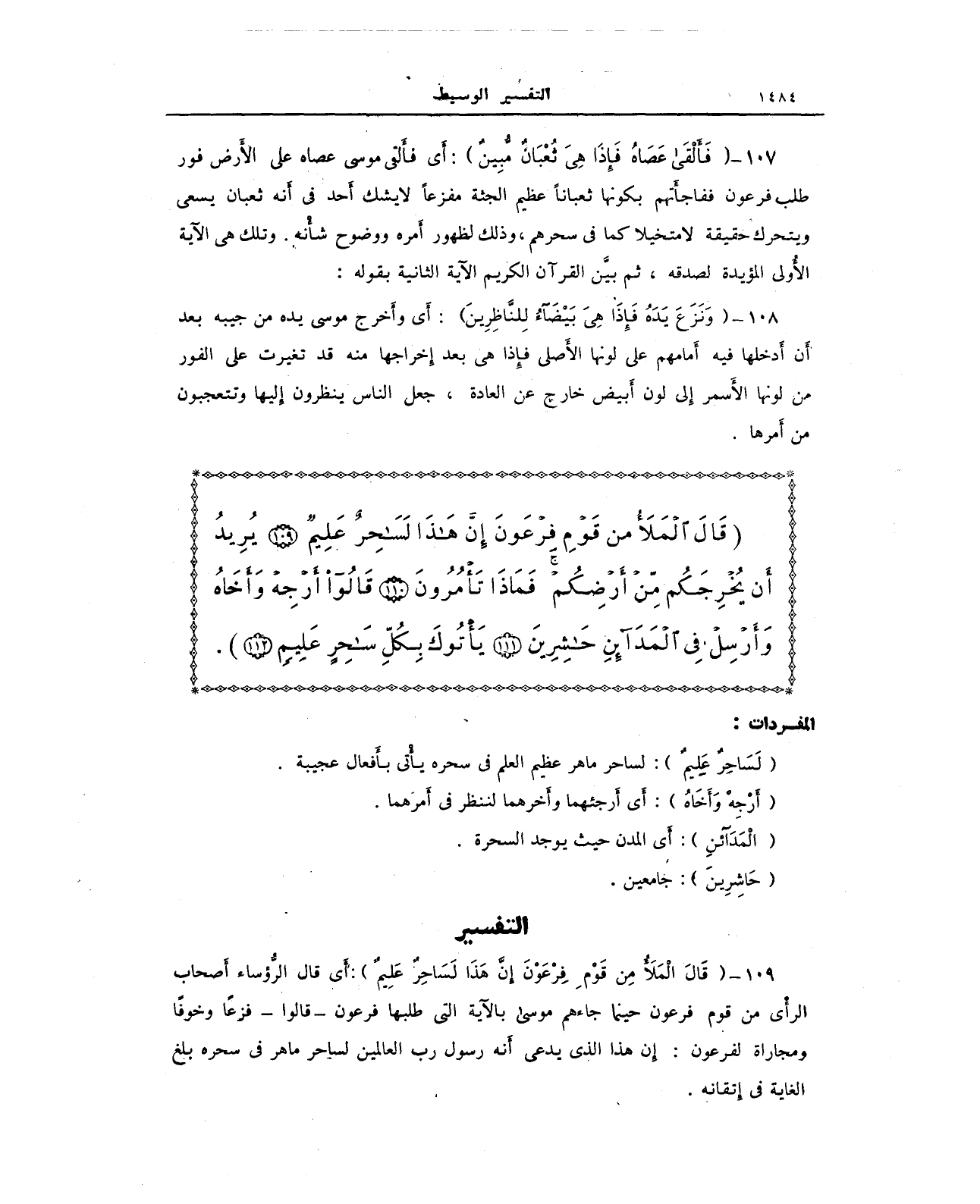 109 - {قَالَ الْمَلَأُ مِنْ قَوْمِ فِرْعَوْنَ إِنَّ هَذَا لَسَاحِرٌ عَلِيمٌ}: أَي قال الرُّؤساء أصحاب الرأْى من قوم فرعون حينما جاءهم موسى بالآية التي طلبها فرعون - قالوا - فزعًا وخوفًا ومجاراة لفرعون: إِن هذا الذي يدعى أَنه رسول رب العالمين لساحر ماهر في سحره بلغ الغاية في إتقانه.