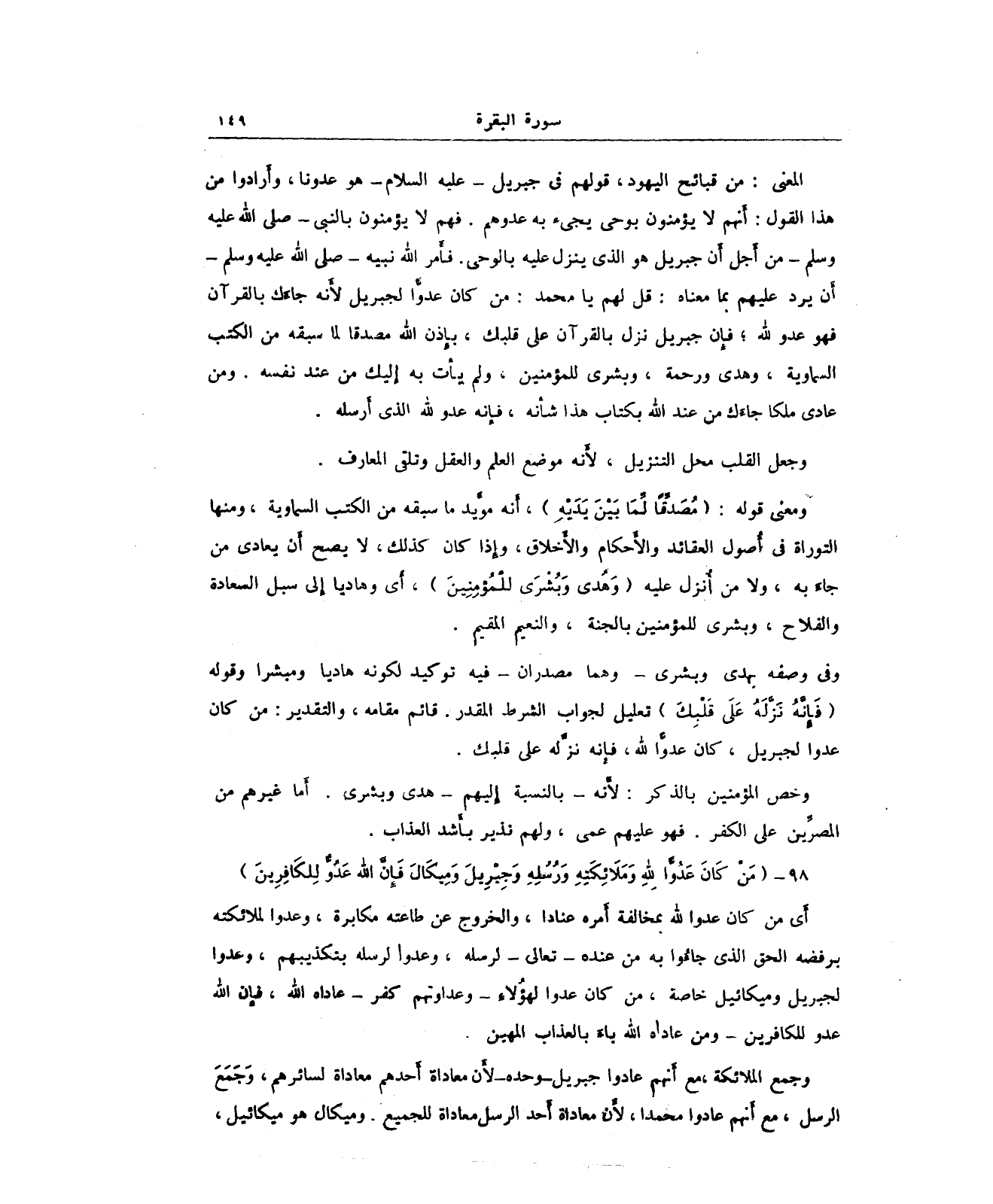 وجعل القلب محل التنزيل, لأنه موضع العلم والعقل وتلقى المعارف ومعنى قوله: {مُصَدِّقًا لِمَا بَيْنَ يَدَيْهِ}، أنه مؤيد ماسبقه من الكتب السماوية، ومنها التوراة في أصول العقائد والأحكام والأخلاق، وإِذا كان كذلك، لا يصح أَن يعادى من جاء به، ولا من أنزل عليه {وَهُدى وَبُشرَى للْمُؤمِنِينَ}، أي وهاديا إلى سبل السعادة والفلاح، وبشرى للمؤمنين بالجنة، والنعيم المقيم.