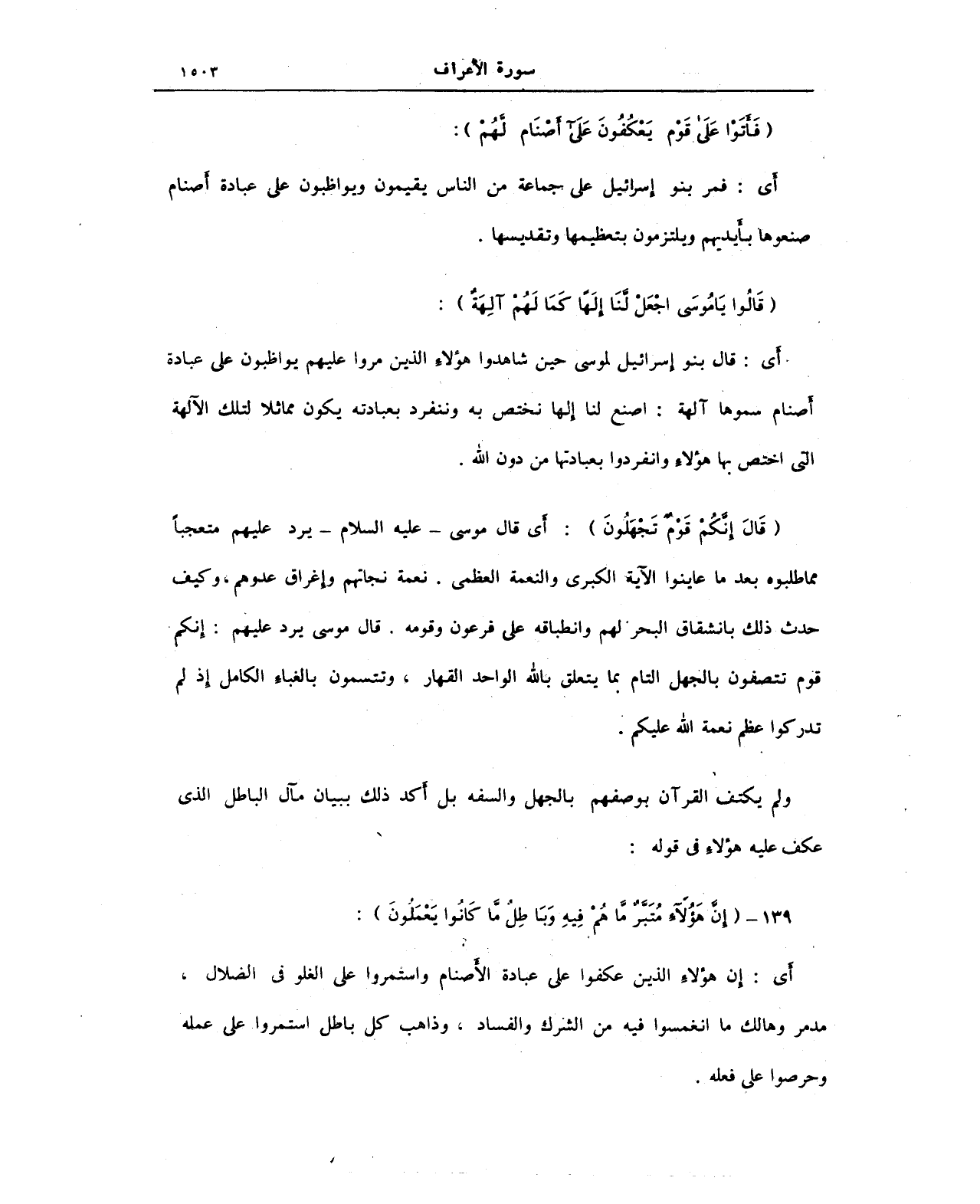 {قَالَ إِنَّكُمْ قَوْمٌ تَجْهَلُونَ}: أَي قال موسى - عليه السلام - يرد عليهم متعجبًا مما طلبوه بعد ما عاينوا الآية الكبرى والنعمة العظمى. نعمة نجاتهم وإِغراق عدوهم, وكيف حدث ذلك بانشقاق البحر لهم وانطباقه على فرعون وقومه. قال موسى يرد عليهم: إِنكم قوم تتصفون بالجهل التام بما يتعلق بالله الواحد القهار، وتتسمون بالغباءِ الكامل إِذ لم تدركوا عظم نعمة الله عليكم.