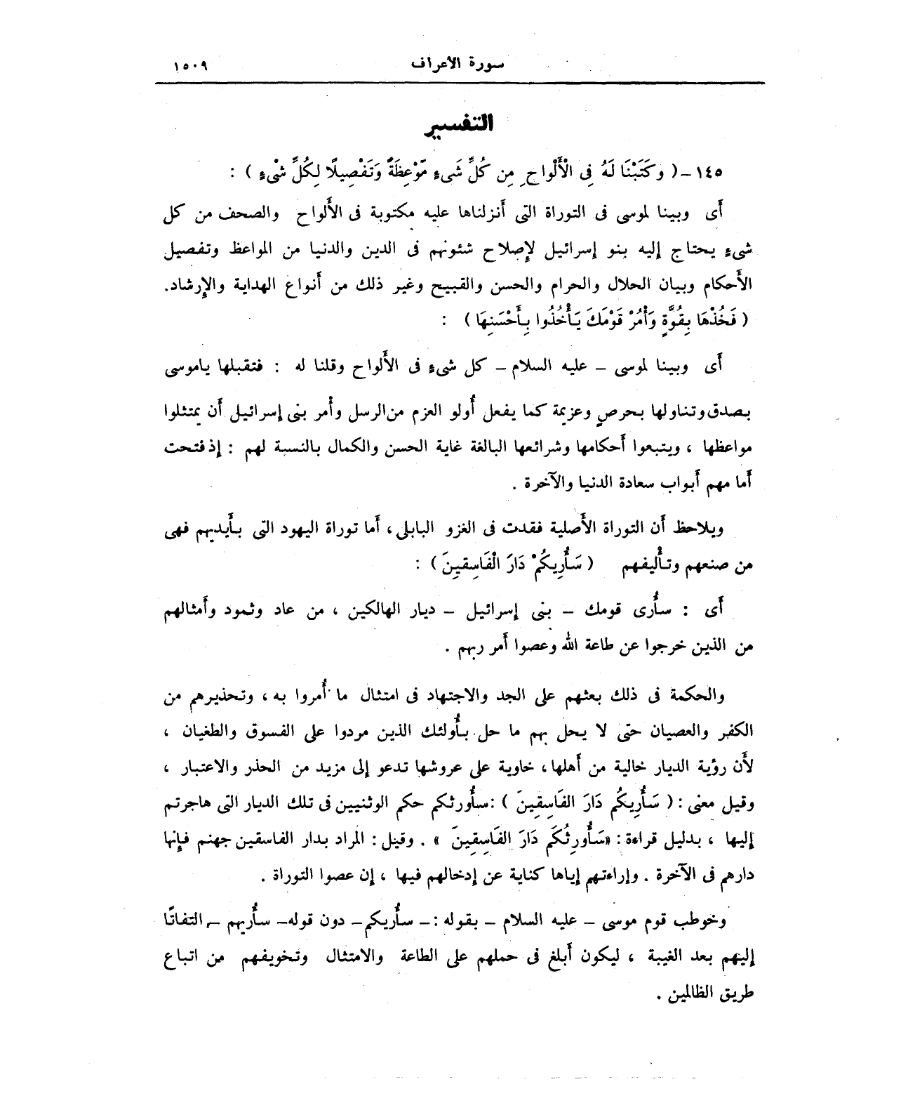 وقيل معنى: {سَأُرِيكُمْ دَارَ الْفَاسِقِينَ}: سأُورثكم حكم الوثنيين في تلك الديار التي هاجرتم إِليها، بدليل قراءة: "سَأُورِثُكَم دَارَ الفَاسِقِينَ". وقيل: المراد بدار الفاسقين جهنم فإِنها دارهم في الآخرة. وإراءتهم إِياها كناية عن إِدخالهم فيها، إِن عصوا التوراة.