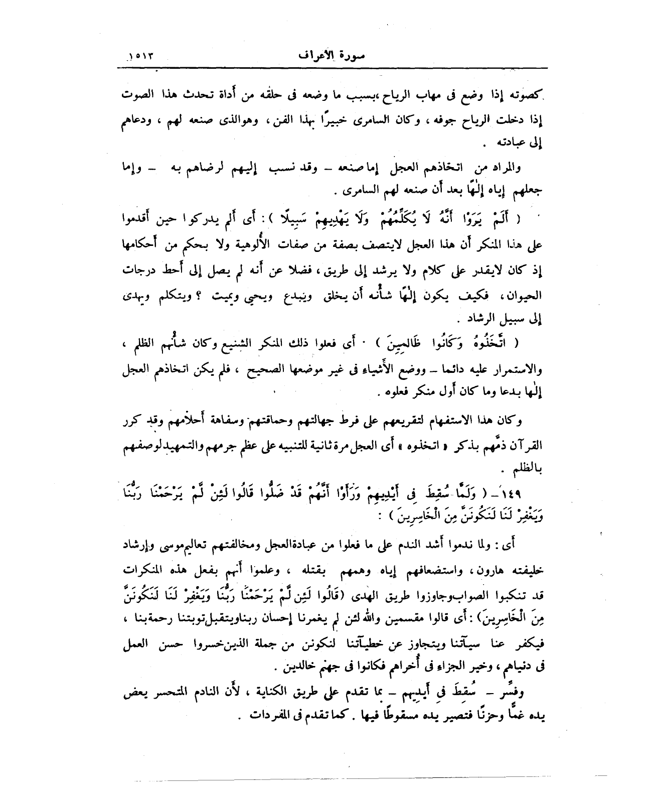وفسِّر - سُقِطَ في أَيدِيهم - بما تقدم على طريق الكناية, لأَن النادم المتحسر يعض يده غمًّا وحزنًا فتصير يده مسقوطًا فيها. كما تقدم في المفردات.
