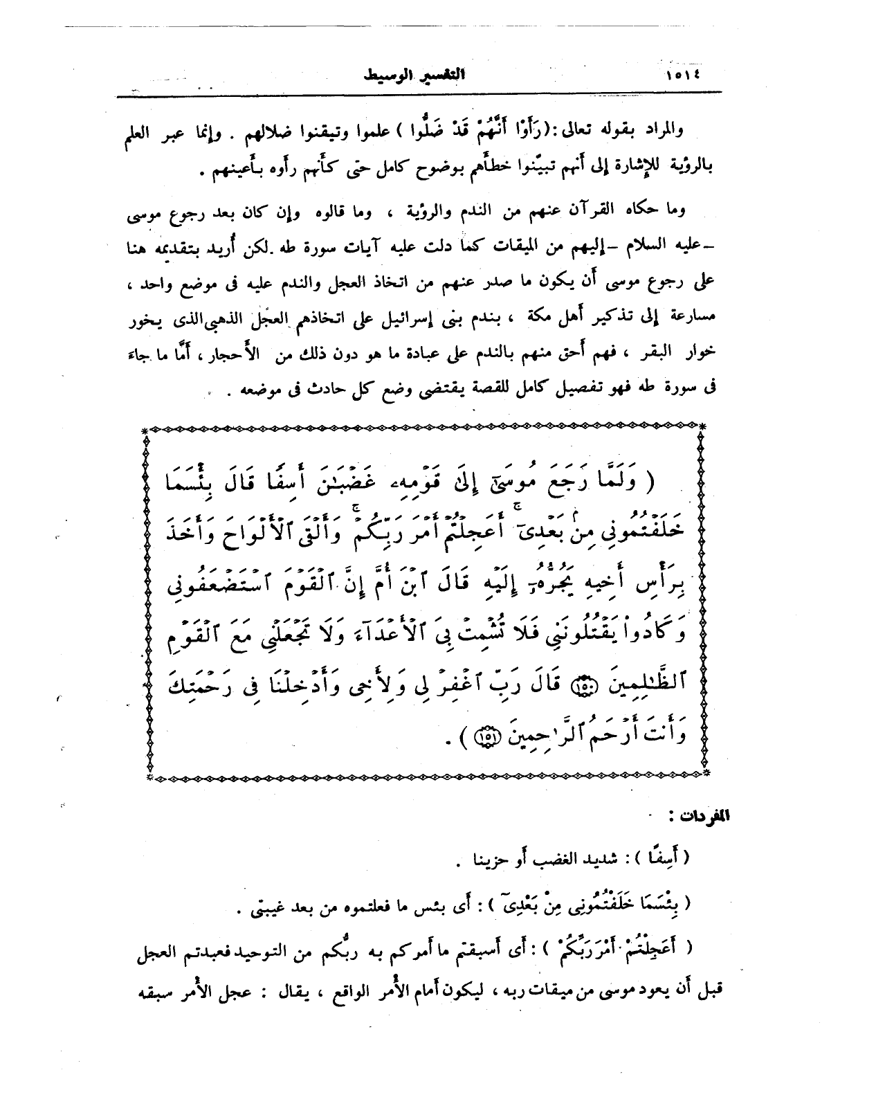 وما حكاه القرآن عنهم من الندم والرؤية، وما قالوه وإِن كان بعد رجوع موسى - عليه السلام - إِليهم من الميقات كما دلت عليه آيات سورة طه. لكن أُريد بتقديمه هنا على رجوع موسى أَن يكون ما صدر عنهم من اتخاذ العجل والندم عليه في موضع واحد، مسارعة إِلى تذكير أَهل مكة، بندم بنى إِسرائيل على اتخاذهم العجل الذهبى الذي يخور خوار البقر، فهم أَحق منهم بالندم على عبادة ما هو دون ذلك من الأَحجار، أَمَّا ما جاءَ في سورة طه فهو تفصيل كامل للقصة يقتضي وضع كل حادث في موضعه.