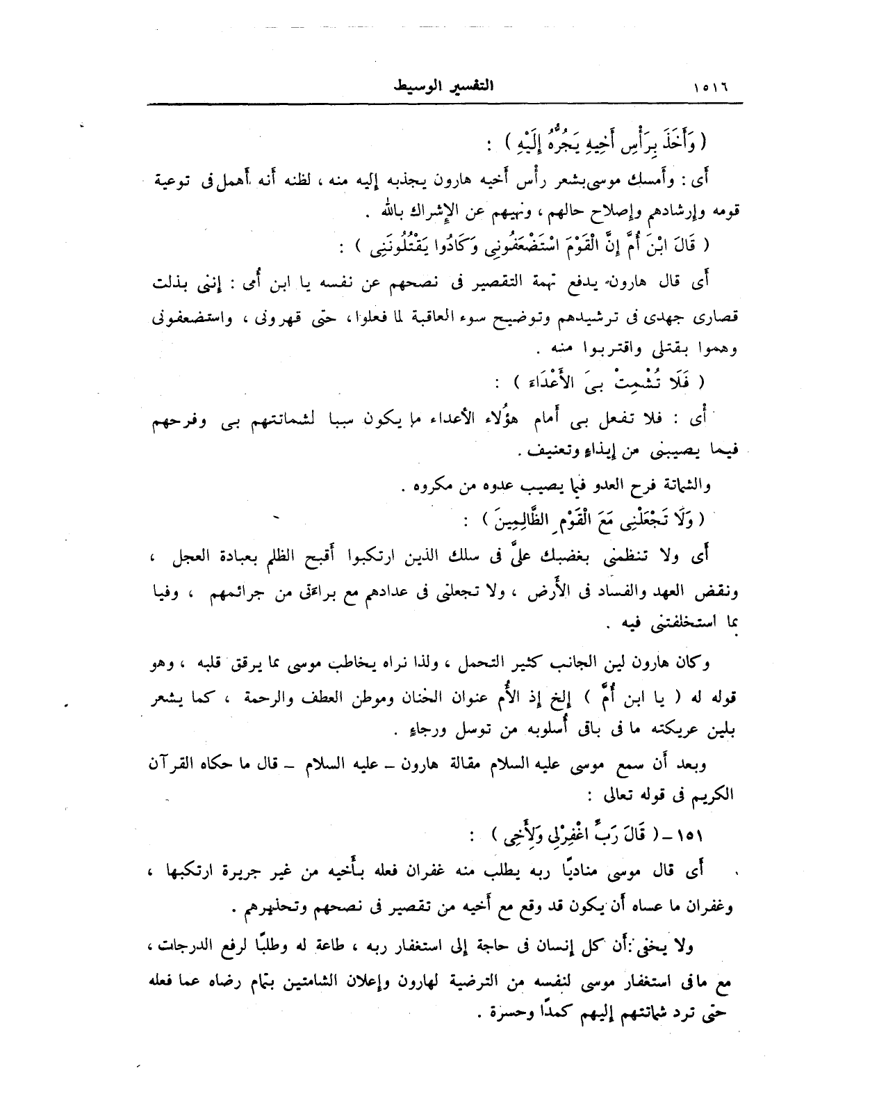 أَي: وأَمسك موسى بشعر رأْس أَخيه هارون يجذبه إِليه منه، لظنه أَنه أَهمل في توعية قومه وإِرشادهم وإِصلاح حالهم، ونهيهم عن الإِشراك باللهِ.