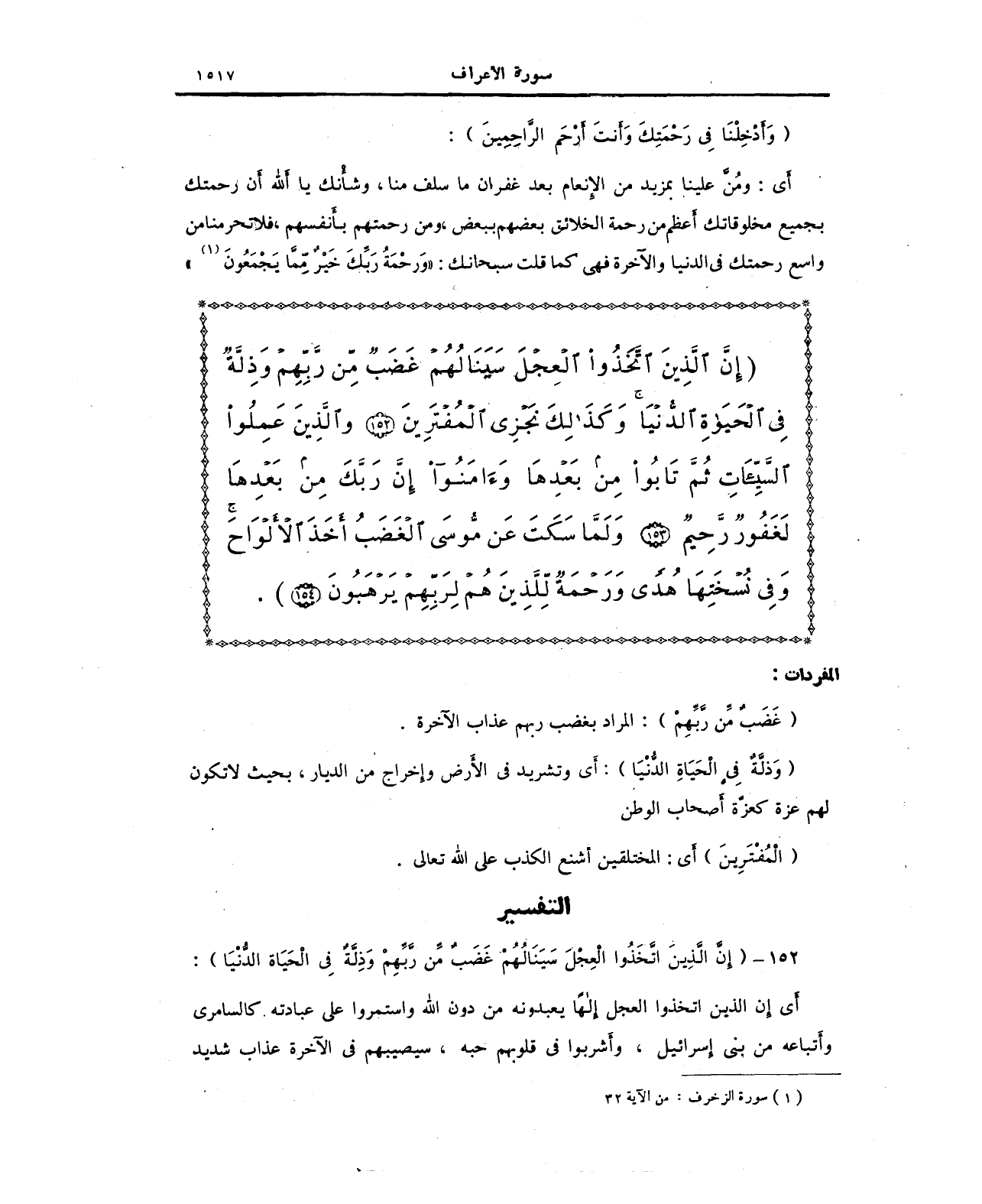 {إِنَّ الَّذِينَ اتَّخَذُوا الْعِجْلَ سَيَنَالُهُمْ غَضَبٌ مِنْ رَبِّهِمْ وَذِلَّةٌ في الْحَيَاةِ الدُّنْيَا وَكَذَلِكَ نَجْزِي الْمُفْتَرِينَ (152) وَالَّذِينَ عَمِلُوا السَّيِّئَاتِ ثُمَّ تَابُوا مِنْ بَعْدِهَا وَآمَنُوا إِنَّ رَبَّكَ مِنْ بَعْدِهَا لَغَفُورٌ رَحِيمٌ (153) وَلَمَّا سَكَتَ عَنْ مُوسَى الْغَضَبُ أَخَذَ الْأَلْوَاحَ وَفِي نُسْخَتِهَا هُدًى وَرَحْمَةٌ لِلَّذِينَ هُمْ لِرَبِّهِمْ يَرْهَبُونَ (154)}.