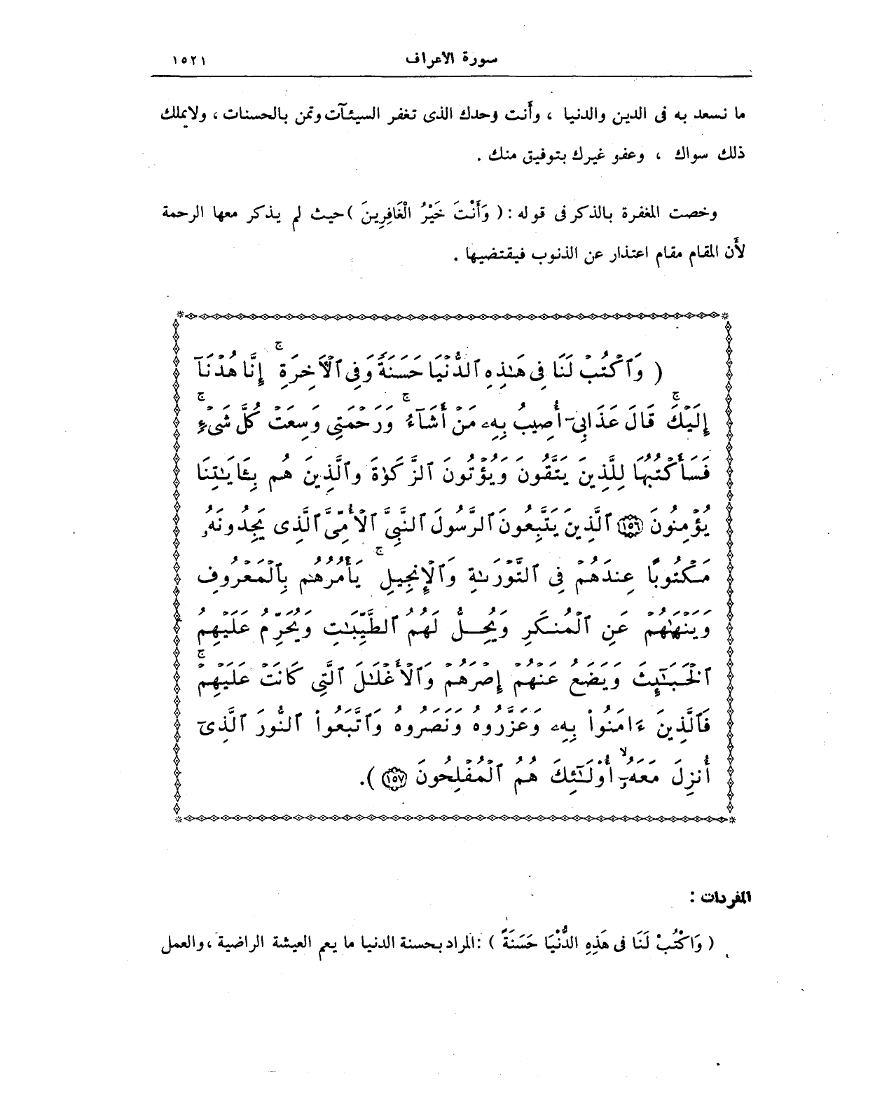 {وَاكْتُبْ لَنَا في هَذِهِ الدُّنْيَا حَسَنَةً وَفِي الْآخِرَةِ إِنَّا هُدْنَا إِلَيْكَ قَالَ عَذَابِي أُصِيبُ بِهِ مَنْ أَشَاءُ وَرَحْمَتِي وَسِعَتْ كُلَّ شَيْءٍ فَسَأَكْتُبُهَا لِلَّذِينَ يَتَّقُونَ وَيُؤْتُونَ الزَّكَاةَ وَالَّذِينَ هُمْ بِآيَاتِنَا يُؤْمِنُونَ (156) الَّذِينَ يَتَّبِعُونَ الرَّسُولَ النَّبِيَّ الْأُمِّيَّ الَّذِي يَجِدُونَهُ مَكْتُوبًا عِنْدَهُمْ في التَّوْرَاةِ وَالْإِنْجِيلِ يَأْمُرُهُمْ بِالْمَعْرُوفِ وَيَنْهَاهُمْ عَنِ الْمُنْكَرِ وَيُحِلُّ لَهُمُ الطَّيِّبَاتِ وَيُحَرِّمُ عَلَيْهِمُ الْخَبَائِثَ وَيَضَعُ عَنْهُمْ إِصْرَهُمْ وَالْأَغْلَالَ الَّتِي كَانَتْ عَلَيْهِمْ فَالَّذِينَ آمَنُوا بِهِ وَعَزَّرُوهُ وَنَصَرُوهُ وَاتَّبَعُوا النُّورَ الَّذِي أُنْزِلَ مَعَهُ أُولَئِكَ هُمُ الْمُفْلِحُونَ (157)}.