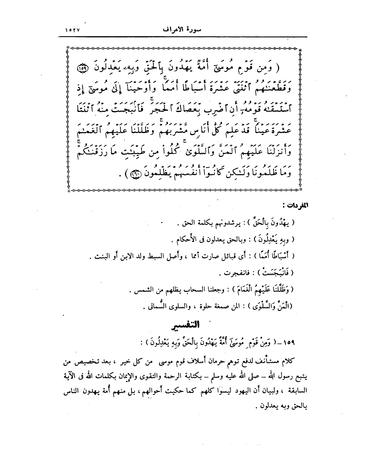 {وَمِنْ قَوْمِ مُوسَى أُمَّةٌ يَهْدُونَ بِالْحَقِّ وَبِهِ يَعْدِلُونَ (159) وَقَطَّعْنَاهُمُ اثْنَتَيْ عَشْرَةَ أَسْبَاطًا أُمَمًا وَأَوْحَيْنَا إِلَى مُوسَى إِذِ اسْتَسْقَاهُ قَوْمُهُ أَنِ اضْرِبْ بِعَصَاكَ الْحَجَرَ فَانْبَجَسَتْ مِنْهُ اثْنَتَا عَشْرَةَ عَيْنًا قَدْ عَلِمَ كُلُّ أُنَاسٍ مَشْرَبَهُمْ وَظَلَّلْنَا عَلَيْهِمُ الْغَمَامَ وَأَنْزَلْنَا عَلَيْهِمُ الْمَنَّ وَالسَّلْوَى كُلُوا مِنْ طَيِّبَاتِ مَا رَزَقْنَاكُمْ وَمَا ظَلَمُونَا وَلَكِنْ كَانُوا أَنْفُسَهُمْ يَظْلِمُونَ (160)}.
