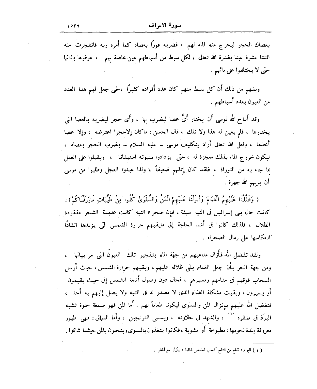 {وَظَلَّلْنَا عَلَيْهِمُ الْغَمَامَ وَأَنْزَلْنَا عَلَيْهِمُ الْمَنَّ وَالسَّلْوَى كُلُوا مِنْ طَيِّبَاتِ مَا رَزَقْنَاكُمْ}: كانت حال بنى إِسرائيل في التيه سيئة، فإِن صحراءَ التيه كانت عديمة الشجر مفقودة الظلال، فلذلك كانوا في أَشد الحاجة إِلى ما يقيهم حرارة الشمس التي يزيدها اتقادًا انعكاسها على رمال الصحراء.