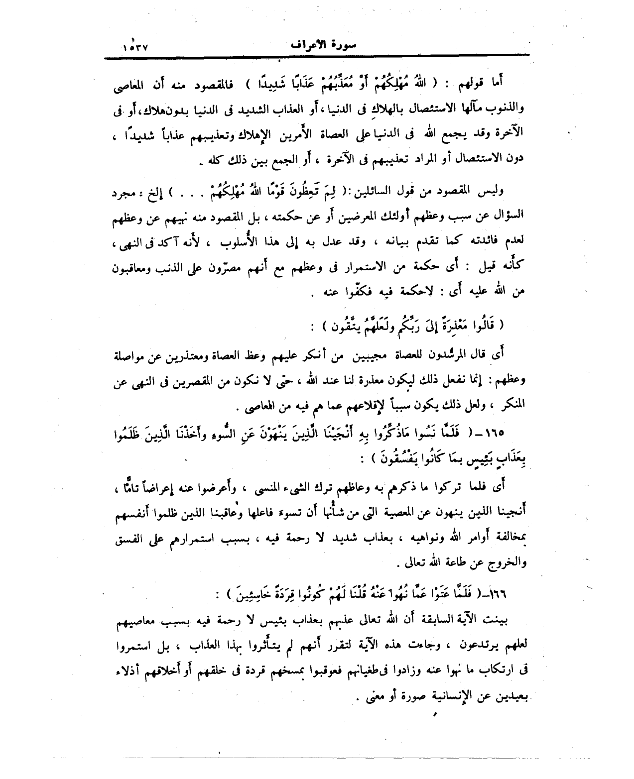 وليس المقصود من قول السائلين: {لِمَ تَعِظُونَ قَوْمًا اللهُ مُهْلِكُهُمْ ... } إلخ: مجرد السؤال عن سبب وعظهم أولئك المعرضين أَو عن حكمته، بل المقصود منه نهيهم عن وعظهم لعدم فائدته كما تقدم بيانه، وقد عدل به إِلى هذا الأُسلوب, لأَنه آكد في النهي، كأنه قيل: أَي حكمة من الاستمرار في وعظهم مع أَنهم مصرّون على الذنب ومعاقبون من الله عليه أَي: لا حكمة فيه فكفّوا عنه.