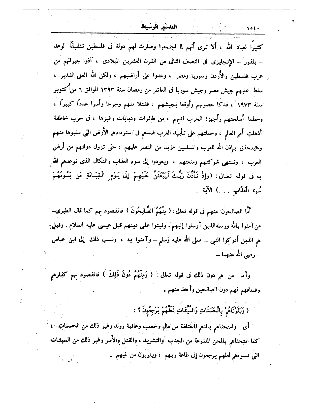 كثيرًا لعباد الله، أَلا ترى أَنهم لما اجتمعوا وصارت لهم دولة في فلسطين تنفيذًا لوعد - بلفور - الإِنجليزى في النصف الثاني من القرن العشرين الميلادى، آذوا جيرانهم من عرب فلسطين والأُردن وسوريا ومصر، وعدوا على أَراضيهم، ولكن الله العلى القدير، سلط عليهم جيش مصر وجيش سوريا في العاشر من رمضان سنة 1393 الموافق 6 من أُكتوبر سنة 1973، فدكا حصونهم وأَوقعا بجيشهم، فقتلا منهم وجرحا وأَسرا عددًا كبيرًا، وحطما أَسلحتهم وأَجهزة الحرب لديهم، من طائرات ودبابات وغيرها، في حرب خاطفة أَذهلت أُمم العالم، وحملتهم على تأييد العرب ضدهم في استردادهم الأَرض التي سلبوها منهم وسيتحقق بإِذن الله للعرب والمسلمين مزيد من النصر عليهم، حتى تزول دولتهم من أَرض العرب، وتنتهى شوكتهم ومنعتهم، ويعودوا إِلى سوءِ العذاب والنكال الذي توعدهم الله به في قوله تعالى: {وَإِذْ تَأَذَّنَ رَبُّكَ لَيَبْعَثَنَّ عَلَيْهِمْ إِلَى يَوْمِ الْقِيَامَةِ مَنْ يَسُومُهُمْ سُوءَ الْعَذَابِ ... } الآية.