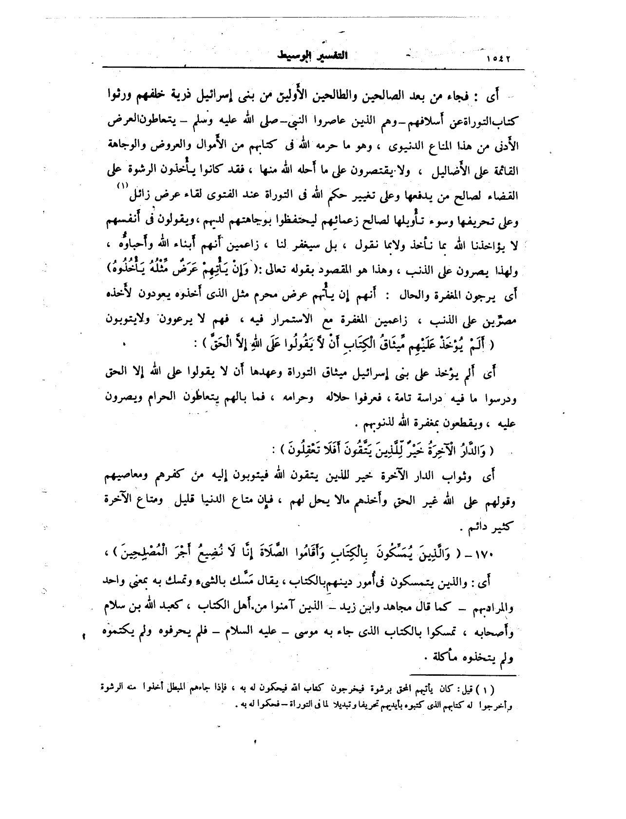 أَي: والذين يتمسكون في أُمور دينهم بالكتاب، يقال مَسَّك بالشىءِ وتمسك به بمعنى واحد والمراد بهم - كما قال مجاهد وابن زيد - الذين آمنوا من أَهل الكتاب، كعبد الله بن سلام وأَصحابه، تمسكوا بالكتاب الذي جاء به موسى - عليه السلام - فلم يحرفوه ولم يكتموه ولم يتخذوه مأكلة.