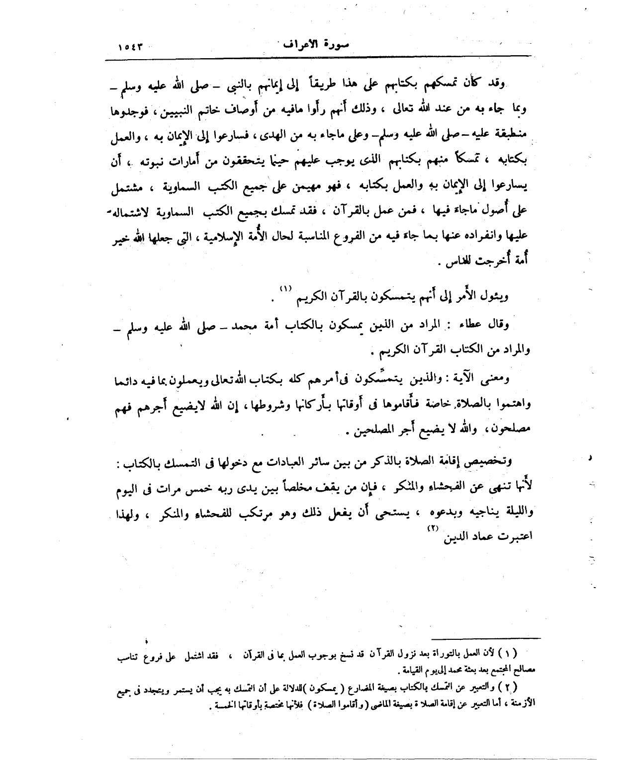 وتخصيص إِقامة الصلاة بالذكر من بين سائر العبادات مع دخولها في التمسك بالكتاب: لأَنها تنهى عن الفحشاءِ والمنكر، فإِن من يقف مخلصًا بين يدي ربه خمس مرات في اليوم والليلة يناجيه ويدعوه، يستحى أَن يفعل ذلك وهو مرتكب للفحشاءِ والمنكر، ولهذا اعتبرت عماد الدين (¬2).
